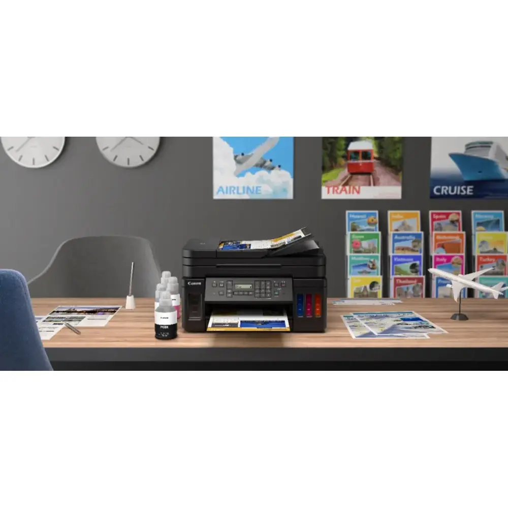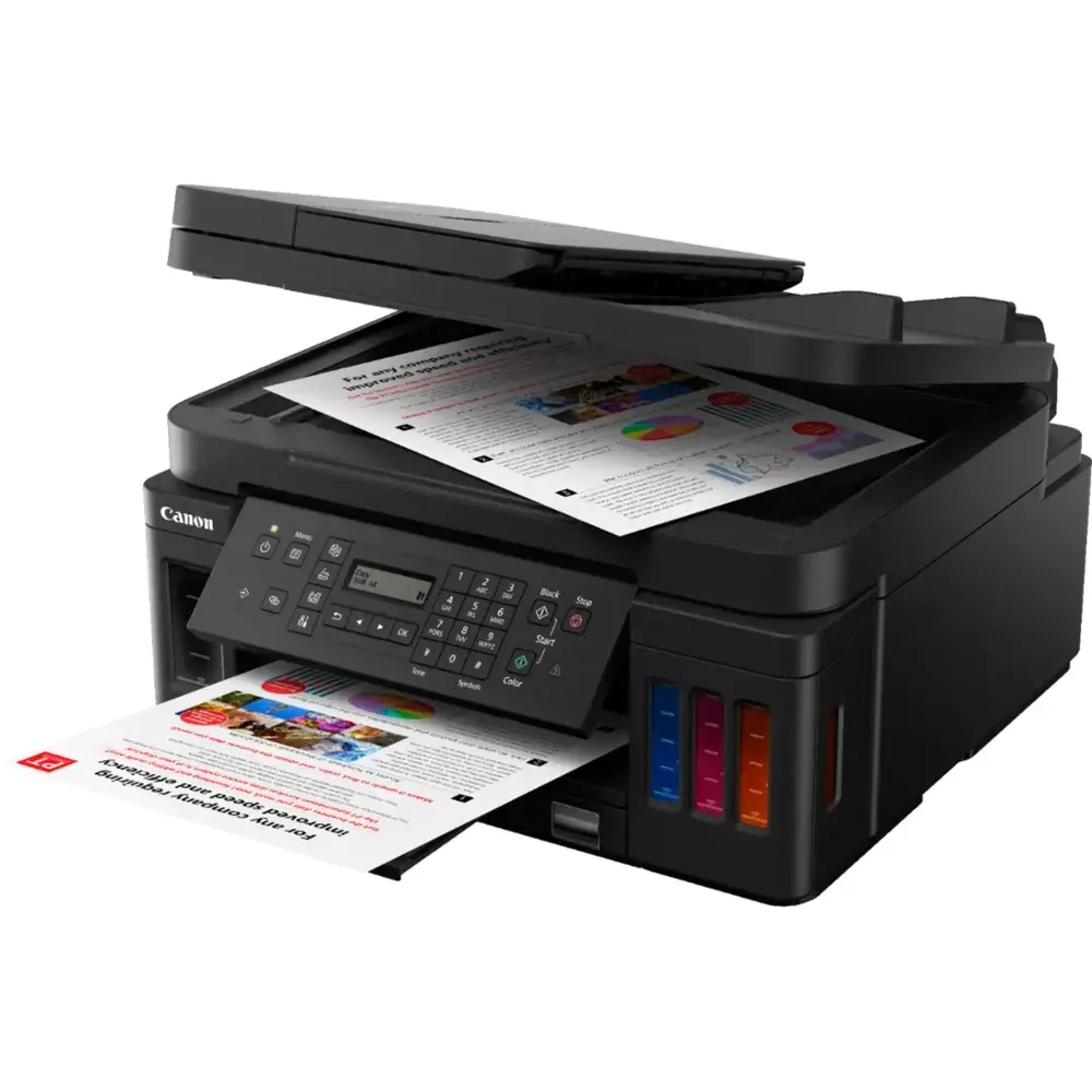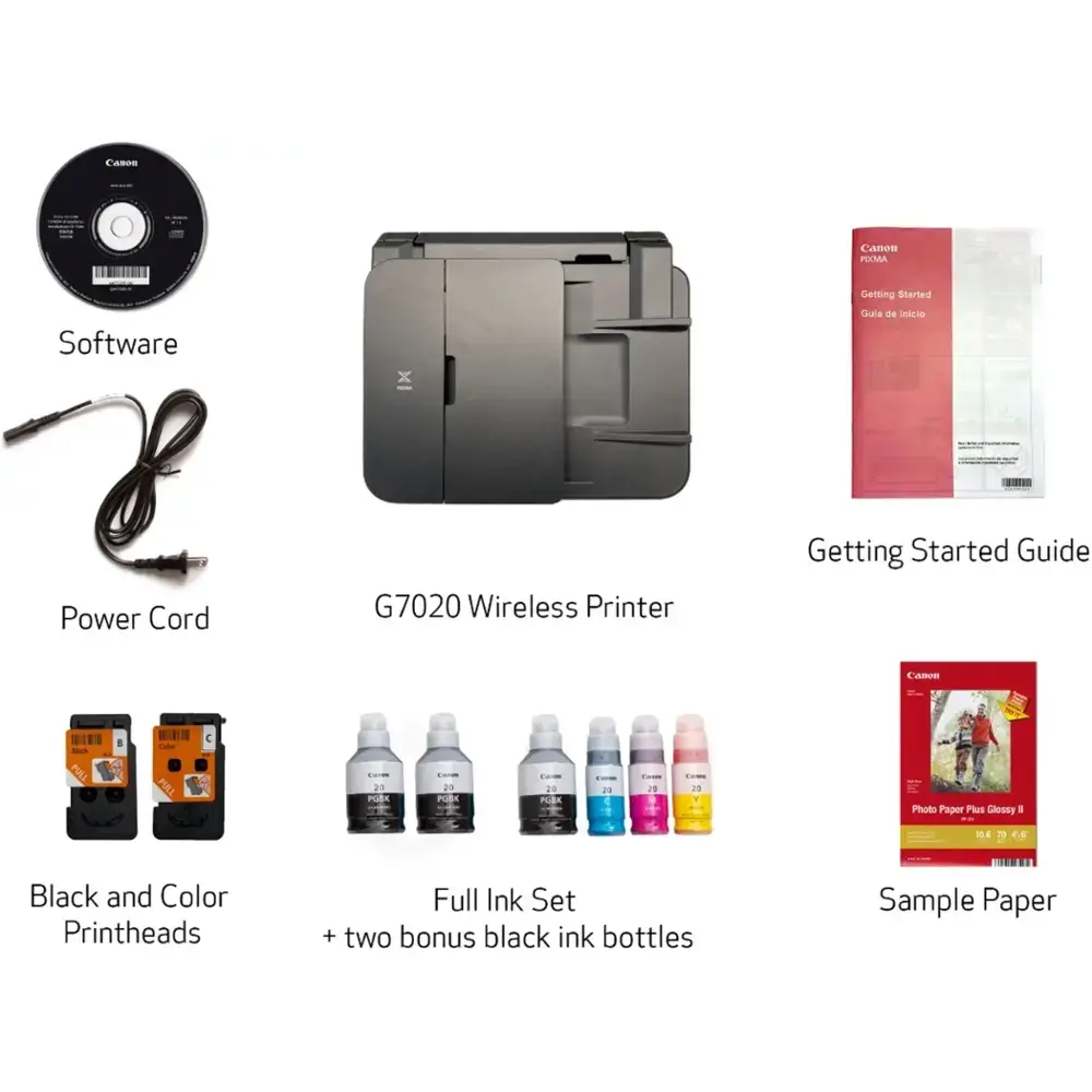 The Canon PIXMA MegaTank G7020 Wireless All-In-One Inkjet Printer offers a MegaTank Refill System, providing high-capacity ink tanks that can print up to 6,000 black or 7,700 color pages. With Wireless Connectivity, it supports Wi-Fi, Ethernet, and mobile printing for seamless flexibility. This All-In-One Functionality allows you to print, scan, copy, and fax all from a single device, making it perfect for home offices. The Automatic Document Feeder (ADF) supports up to 35 sheets for efficient scanning and copying, while the Fast Print Speed of up to 13 pages per minute for black and 6.8 pages per minute for color ensures quick results. Enjoy the convenience of Borderless Printing for photos and presentations, and save on costs with High-Yield Ink, offering long-term savings. The printer is also equipped with an intuitive User-Friendly Control Panel, making it easy to navigate settings and features