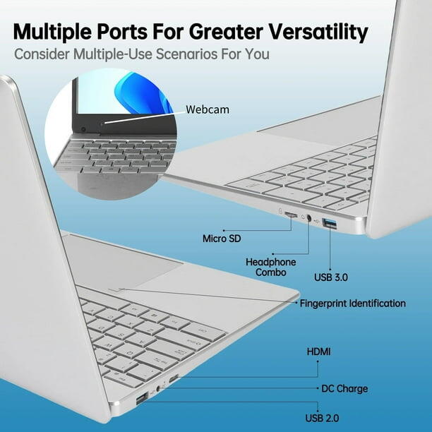 The 15.6-inch laptop offers outstanding performance with an Intel Celeron N5095 processor, which reaches speeds of up to 2.9GHz, combined with cooling fins and a turbine fan to ensure optimal performance. The upgraded 12GB LPDDR4 RAM significantly improves speed and efficiency, while the 256GB SSD offers ample storage. The laptop features a 15.6-inch FHD IPS display with a 90% screen-to-body ratio, providing sharp, vibrant visuals. It also includes convenient features such as a fingerprint sensor for easy login and a backlit keyboard for comfortable typing in dim environments. With a large 5000mAh battery, it ensures long-lasting use for work, study, gaming, and more.