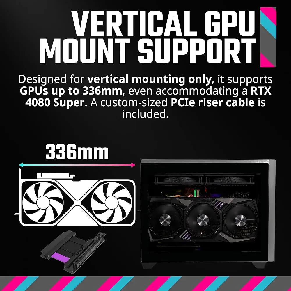 • Vertical GPU Mount: Show off your graphics card and optimize airflow.