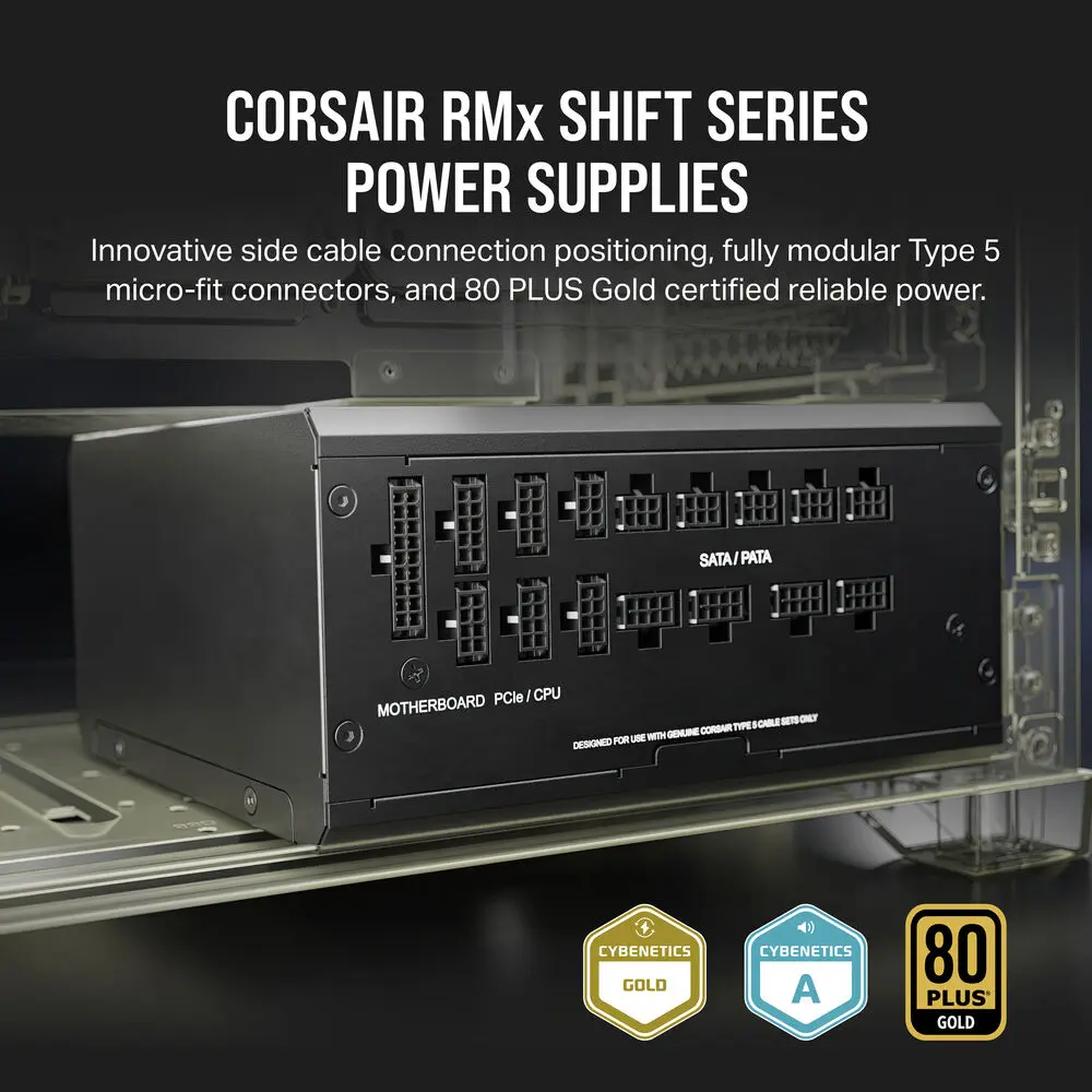The Corsair RM1200x Shift is a cutting-edge power supply unit that redefines power delivery and cable management. With its innovative side-mounted cable connectors, fully modular design, and high-performance components, it's the perfect choice for demanding PC builds.