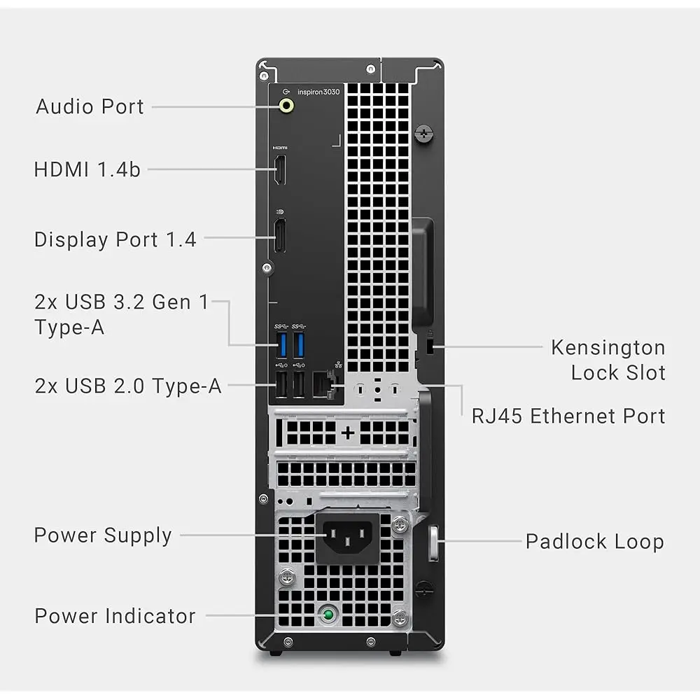 - Wide Range of Ports: The Inspiron 3030 features eight USB ports (including USB 3.2 and USB 2.0) spread across the front and rear of the system, giving you plenty of options for connecting external devices such as printers, storage drives, and other peripherals.