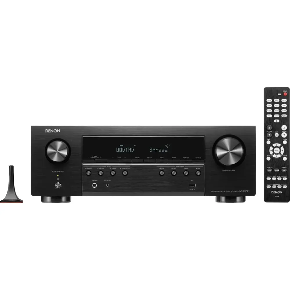 The Denon AVR-S670H 5.2-Ch. AV Home Theater Receiver delivers powerful, immersive sound with 75W x 5 channels for an exceptional audio experience. Enjoy stunning 8K Ultra HD and HDR support for crystal-clear visuals, complemented by HEOS built-in for seamless wireless music streaming throughout your home. Effortlessly control your system with Alexa compatibility, all wrapped in a sleek black design with intuitive controls