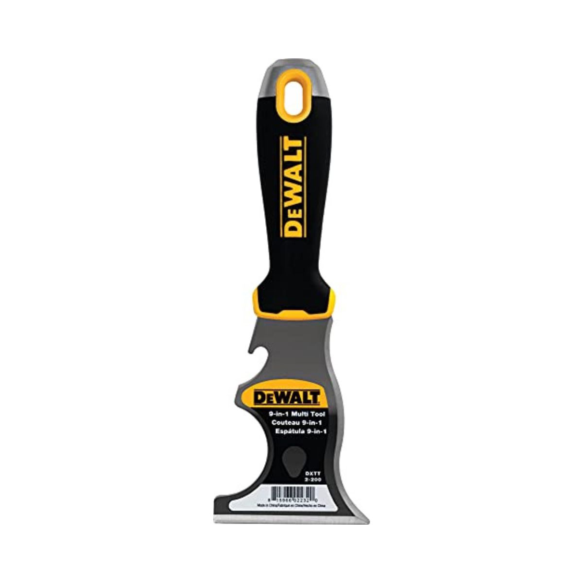 The 9-in-1 Drywall Painter's Knife with Nylon Handle features a straight scraper, concave and convex curved scrapers, gouger, paint roller cleaner, can opener, bottle opener,nail puller,screwdriver and metal hammer end. Featuring a high-quality, hardened carbon steel blade, and lightweight nylon handle ergonomically designed for all-day use. The handle is riveted to the blade for additional strength.