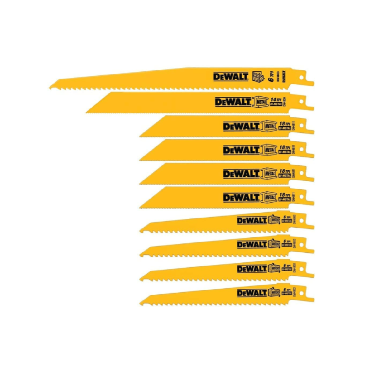 The DEWALT DW4898 10 Piece Bi-Metal Reciprocating Saw Blade Set with Case is a convenient set of reciprocating saw blade for your wood and metal cutting needs. This set includes: 4X DW4802 6-Inch 6 TPI Taper Back Bi-Metal Reciprocating Blade for General Purpose Wood Cutting, 4X DW4811 6-Inch 18 TPI Straight Back Bi-Metal Reciprocating Blade for heavy metal cutting, 1X 8-Inch 14 TPI Straight Back Bi-Metal Reciprocating Blade for metal cutting, and 1X 9-Inch 6 TPI Taper Back Bi-Metal Reciprocating Blade for General Purpose Wood Cutting. These blades come in an adjustable size Tough Case that is designed to fit in you kit box or storage bag for easy convenient storage.Manufacturer: Dewalt Part Number: DW4898 Item Weight: 12.2 ounces Product Dimensions: 12.56 x 7.31 x 1.37 inches Item model number: DW4898 Is Discontinued By Manufacturer: No Size: Set Color: Yellow Style: Reciprocating saw blade Material: Metal Item Package Quantity: 1 Number Of Pieces: 10 Special Features: 10 pack Usage: Wood, metal, PVC Included Components: DWAR656 (4), DWAR814 (1), DWAR618 (4), DWAR956 (1), Tough Case® Batteries Included?: No Batteries Required?: No