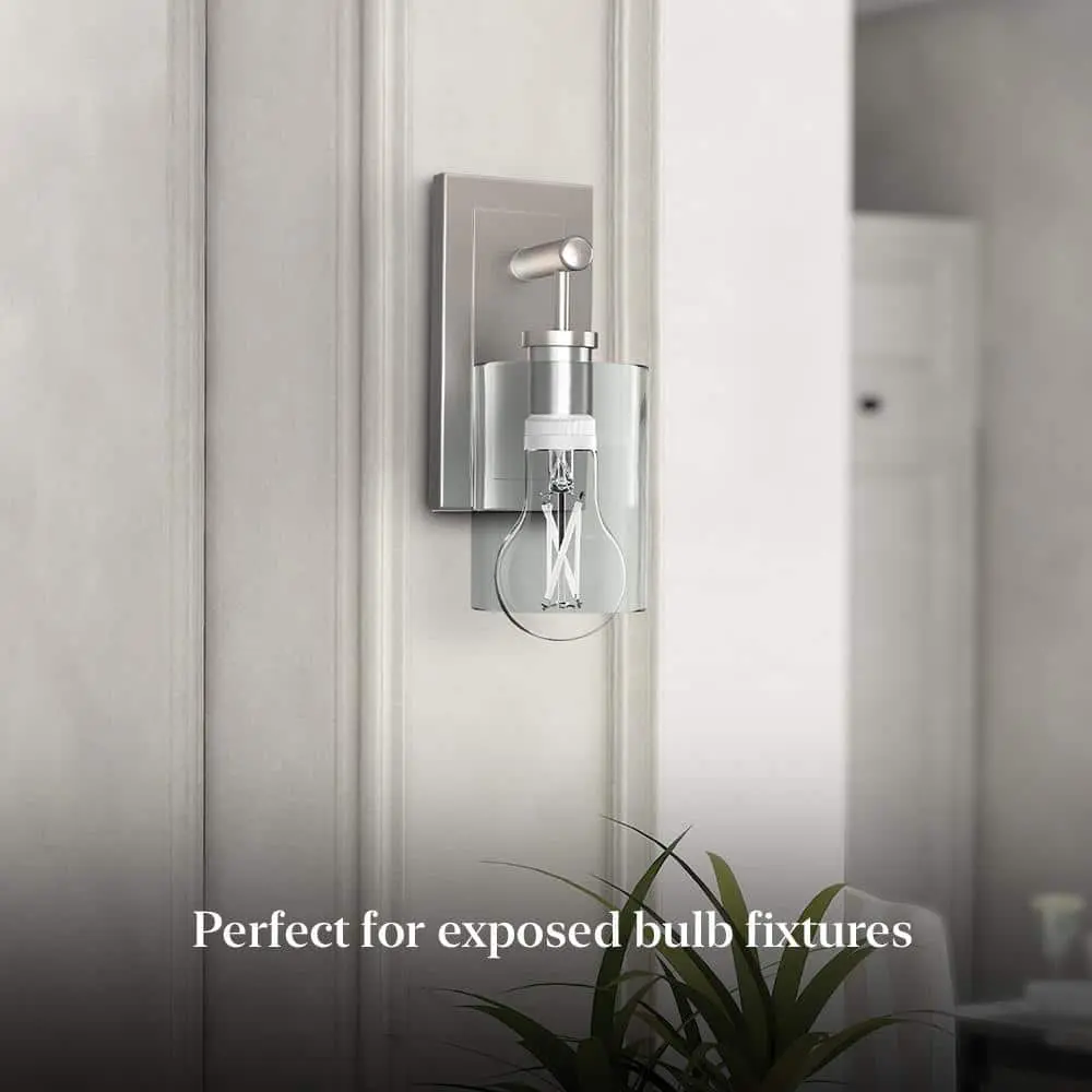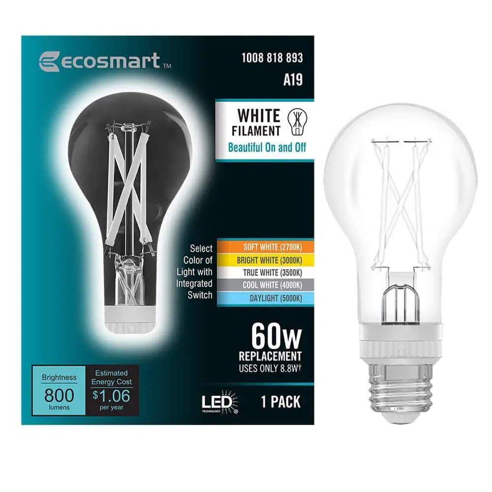 Enhance your lighting with EcoSmart's stylish Exposed White Filament LED Bulbs, offering a modern twist on classic vintage bulbs. These innovative bulbs combine traditional clear glass A-shape designs with sleek, low-profile white filaments. Unlike yellow filaments, they seamlessly blend into any decor, providing a timeless look that suits any room. Offering dimmable lighting in 2700K, 3000K, 3500K, 4000K, or 5000K, they are ideal for spaces such as craft rooms, kitchens, bathrooms, and laundry rooms, providing a bright and invigorating atmosphere. The bluish-white light is perfect for tasks that require precision, like reading or working on detailed projects. These bulbs fit in any medium (E26) base fixture and are perfect for both general-purpose and decorative lighting. The A19605CCTCA/WFIL/ECP bulb produces 800 lumens while consuming just 8.8 watts, which is up to 85.3% more energy-efficient than a standard 100-watt incandescent bulb. With a high CRI of 90+, they bring out vibrant, true-to-life colors, and they can last up to 15,000 hours, with an estimated annual energy cost of only $1.06. Whether for residential or commercial use, these bulbs provide a stylish touch to any space.