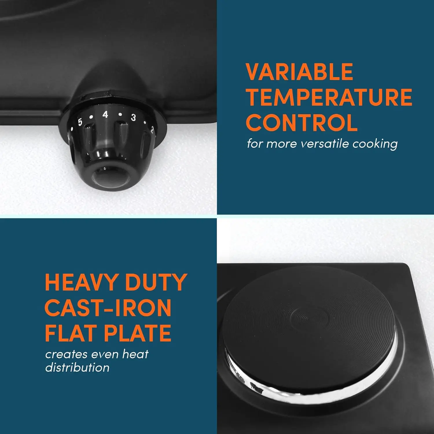 Color: Black Material: Plastic Feature: Manual Brand: Elite Gourmet Heating Elements: 2 Dimensions: 9" D x 16.5" W x 3" H Wattage: 1500 watts Controls: Knob Burner Type: Electric Included: Double Burner
