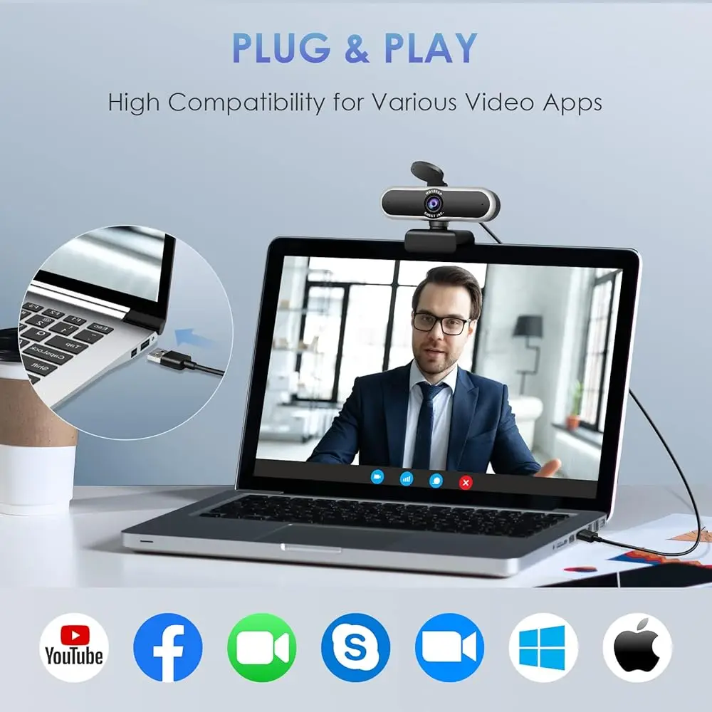 • Multi-Application Compatibility: This webcam works seamlessly with various video platforms such as Zoom, Skype, FaceTime, Facebook, YouTube, and more, making it perfect for online work.