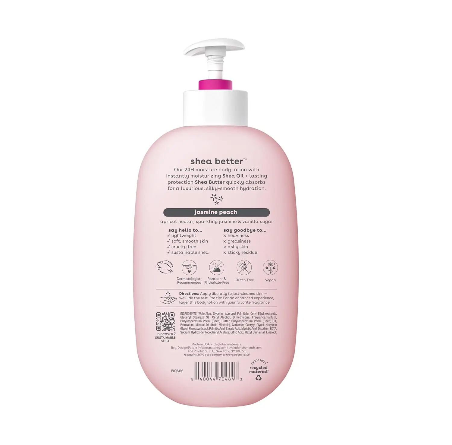 SHEA BETTER BODY LOTION: Sparkling Jasmine Peach scent with notes of apricot nectar, jasmine, and vanilla sugar.24-HOUR MOISTURE: Lightweight, non-greasy lotion for all-day hydration without stickiness.APPLICATION: Apply liberally to clean skin; for enhanced results, layer with your favorite fragrance.SUSTAINABLE SKIN CARE: Contains 7 nourishing oils and butters, including natural shea butter for lasting moisture.ALL-NATURAL SHEA BUTTER: Made with sustainably-sourced 100% natural shea butter; paraben-free, phthalate-free, gluten-free, vegan, hypoallergenic, and cruelty-free.
