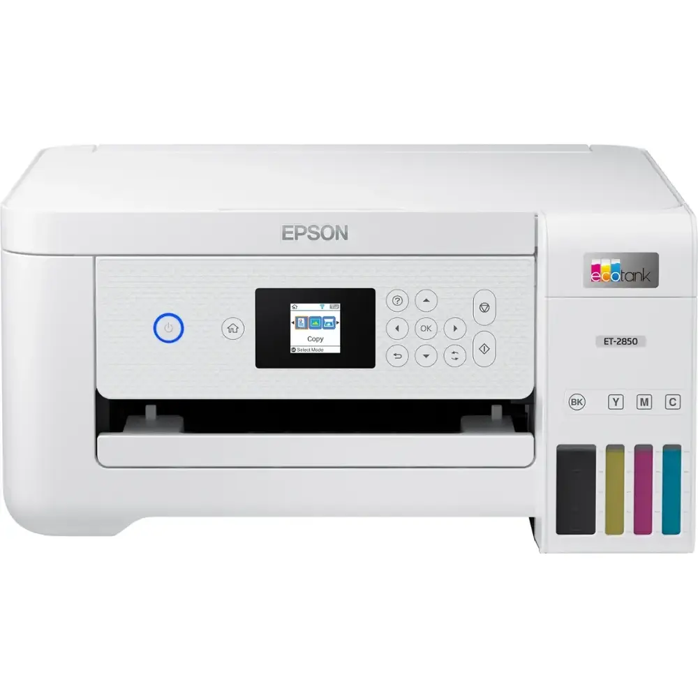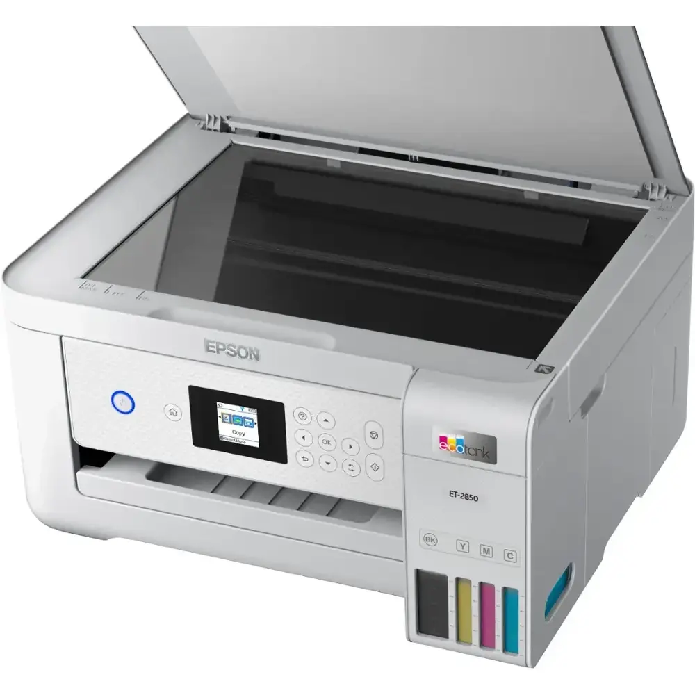 The Epson EcoTank ET-2850 is a cartridge-free, high-capacity ink tank printer designed for affordability, convenience, and efficiency. It features auto-duplex printing, a high-resolution flatbed scanner, and a color display, making it a perfect choice for home and family use. With Epson's EcoFit ink bottles, refilling is easy and worry-free, while Micro Piezo Heat-Free technology ensures sharp text and vibrant color prints on various paper types.