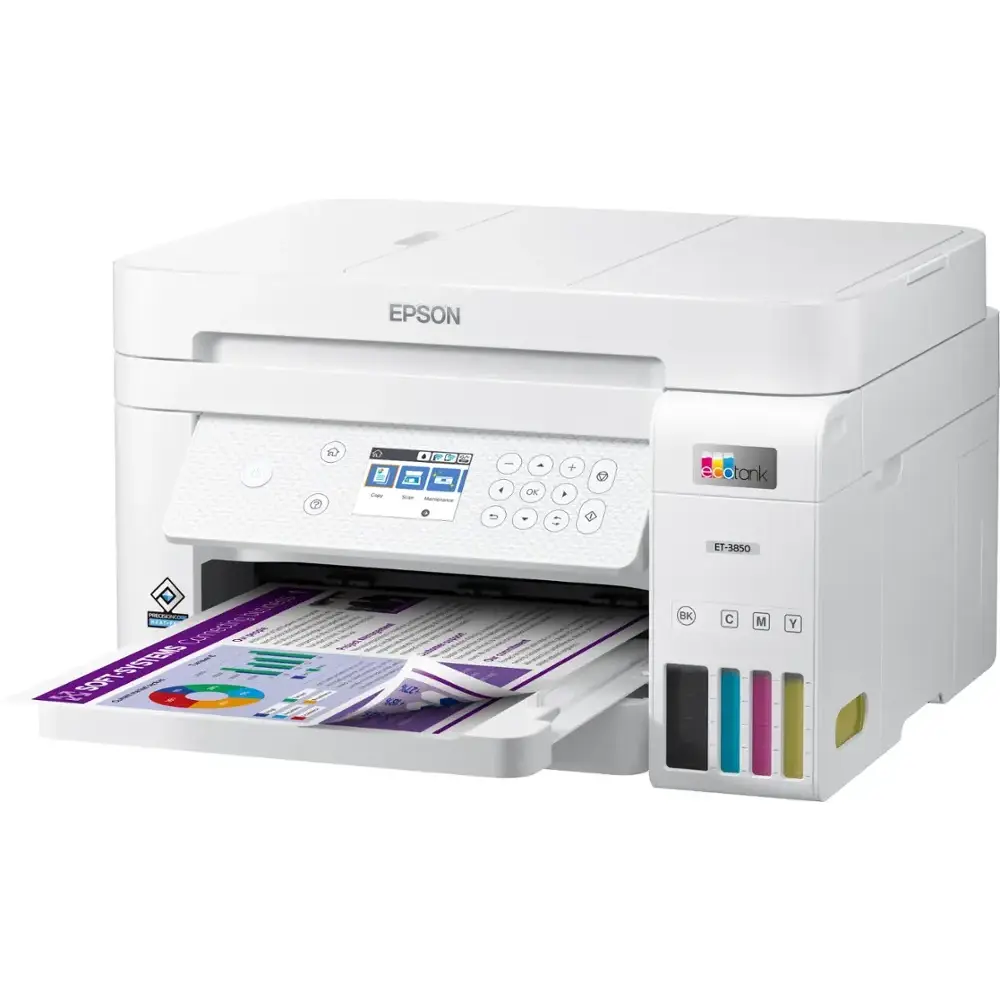 The EcoTank ET-3850 is designed for busy offices that need a fast, cost-effective, and user-friendly printer with excellent features. This innovative cartridge-free printer uses high-capacity, refillable ink tanks, reducing the worry of running out of ink and saving significantly on replacement ink. It offers an auto document feeder, quick printing, exceptional print quality, efficient paper handling, a high-resolution flatbed scanner, and a large color display, making it an ideal choice for your home office.