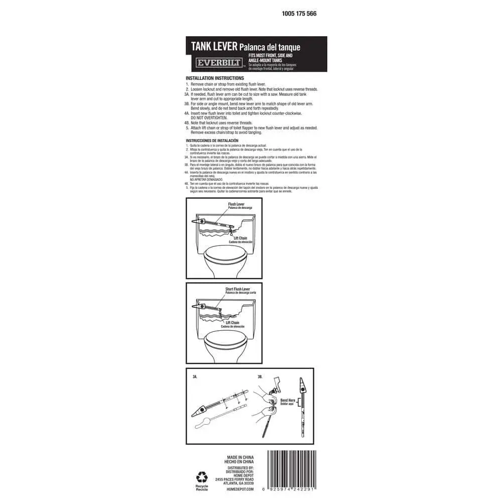 This toilet tank lever is designed to fit most front-mount toilets, offering a simple and stylish way to remodel your bathroom. It’s easy to install and includes a white plastic handle, plastic arm, and white spud and nut.