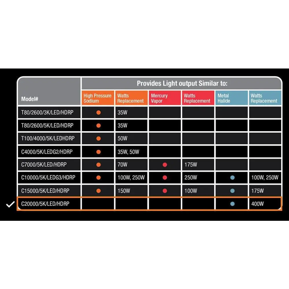 The C20000/5K/LED/HDRP corn cob-shaped LED light bulb from Feit Electric provides powerful illumination for large rooms, barns, or any area requiring bright light. Featuring an E26 (medium) base and an included E26 to E39 (mogul) base adapter, this bulb easily upgrades HID non-ballast fixtures to LED. With ultra-efficient LED technology, it emits 20,000 Lumens while consuming only 150 watts—up to 85% less energy than the equivalent 1,000-watt incandescent bulb. This bulb has an impressive lifespan of 30,000 hours (27.4 years) and is 100% mercury-free and ROHS compliant. It operates within a 120-277 volt range and can replace up to a 400W Metal Halide HID bulb. LEDs don’t require ballast, so installation is quick, and you’ll enjoy instant brightness and energy savings.