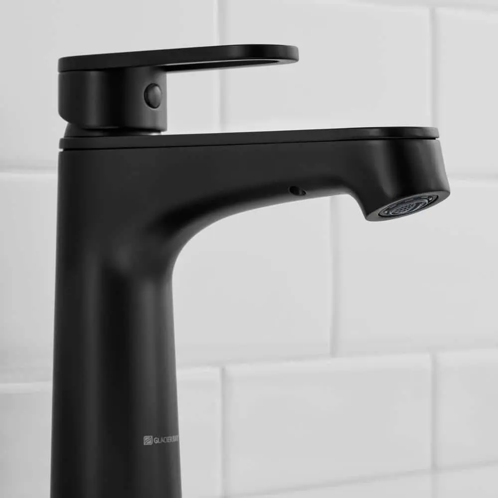 The Glacier Bay Kendrick Single Hole Single-Handle High-Arc Bathroom Faucet in Matte Black features sleek, modern lines that add sophistication to any bathroom. WaterSense certified, it offers a 1.2 GPM flow rate to help reduce water usage, while the ceramic disc valve ensures drip-free performance. Designed for ease of use, it includes a metal lever handle for precise control and a high-arc spout that provides ample sink space. Additionally, this faucet comes with a push-down pop-up drain assembly for convenience