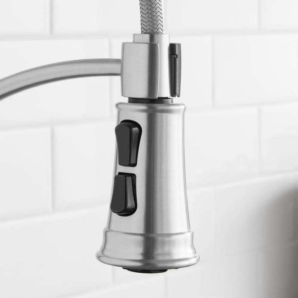 The Glacier Bay Mandouri Spring Neck Pull-Down Sprayer Kitchen Faucet with TurboSpray, FastMount, and Soap Dispenser in Stainless Steel is the perfect way to modernize your kitchen. With its commercial-style design and open-coil spout, it adds an industrial touch to complement contemporary kitchen décor. The faucet features a single-handle design with a sleek stainless steel finish. It includes a pull-down spray wand with two spray modes: aerated spray and TurboSpray, which provides a more powerful spray pattern for efficiently cleaning pots, pans, and dishes. The faucet also boasts a ceramic disc cartridge for drip-free performance and offers a 1.8 GPM flow rate for optimal water efficiency. Thanks to the exclusive FastMount mounting system, installation is quick and easy. Additionally, the faucet comes with a convenient soap dispenser for added functionality.