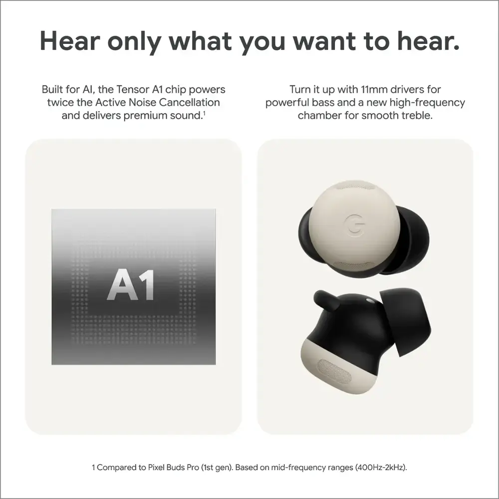 Pixel Buds Pro 2 are designed for ultimate comfort and the most secure fit, making them the perfect earbuds for your Pixel devices. Powered by the Tensor A1 chip, they deliver premium, immersive sound while canceling twice as much noise as before.¹