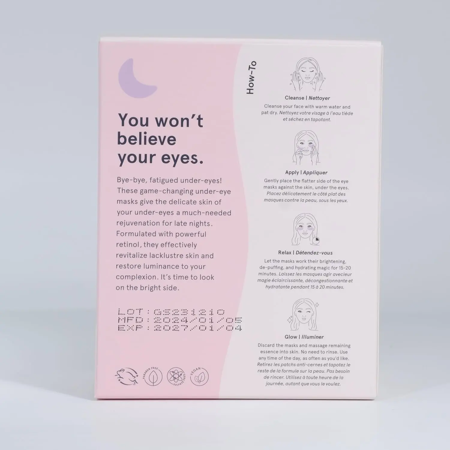 Ultimate R&R - Brighten your eyes overnight with our retinol under-eye masks. Infused with retinol, these anti-aging patches reduce fine lines and revitalize tired skin for a luminous look.Bye-Bye, Raccoon Eyes - Had a late night or a good cry? Our brightening patches minimize puffiness and dark circles, ensuring you never hear "you look tired" again.Repair in Your Sleep - Our masks feature a blend of sea moss, ceramides, and fatty acids to restore delicate under-eye skin, leaving you refreshed by morning.Loved by Thousands - Featured in Fab Fit Fun, Ipsy, and Boxy Charm, our eye patches are a favorite of stars like Jessica Alba and Leona Lewis. Join the fans and see the difference!Great Gift for Glow-Getters - Perfect for birthdays or bachelorette parties, our patches come with a 30-Day Feel Good Policyif you're not satisfied, well make it right!