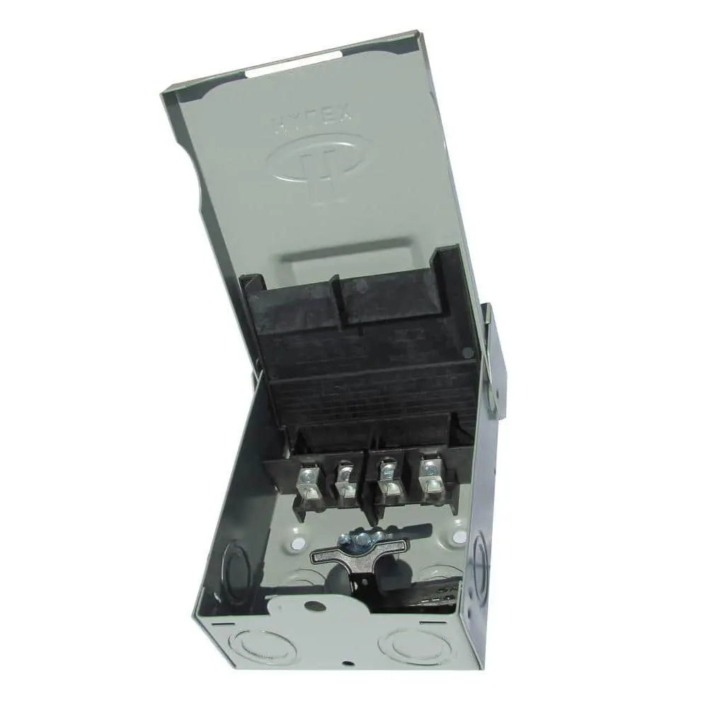 The Halex 60 Amp 240-Volt Non-Fuse Metallic AC Disconnect is designed to safely disconnect power from an air conditioning unit, ensuring secure working conditions. This non-fuse, puller-style disconnect is UL listed and features an enclosed pull-out switch. It is compatible with both copper and aluminum lug wire, with a range of 14-3.