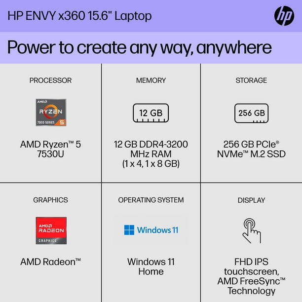The HP ENVY x360 15" convertible laptop is designed to power your creativity and productivity, offering versatility and performance wherever you go. With its 360-degree hinge, you can seamlessly switch between four positions—laptop, reverse, tent, and tablet—adapting to whatever you’re working on. Powered by the AMD Ryzen 5 7530U processor and AMD Radeon graphics, this laptop delivers fast performance and vibrant visuals. Whether you’re working, watching, or gaming, the micro-edge Full HD IPS touchscreen and long-lasting battery ensure an immersive experience. Plus, with enhanced security features like Windows Hello and a 5MP webcam, it’s both safe and stylish.