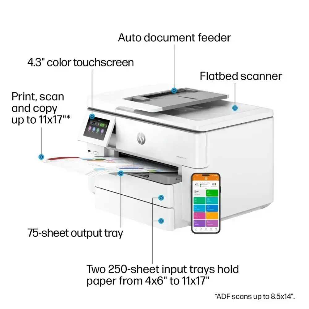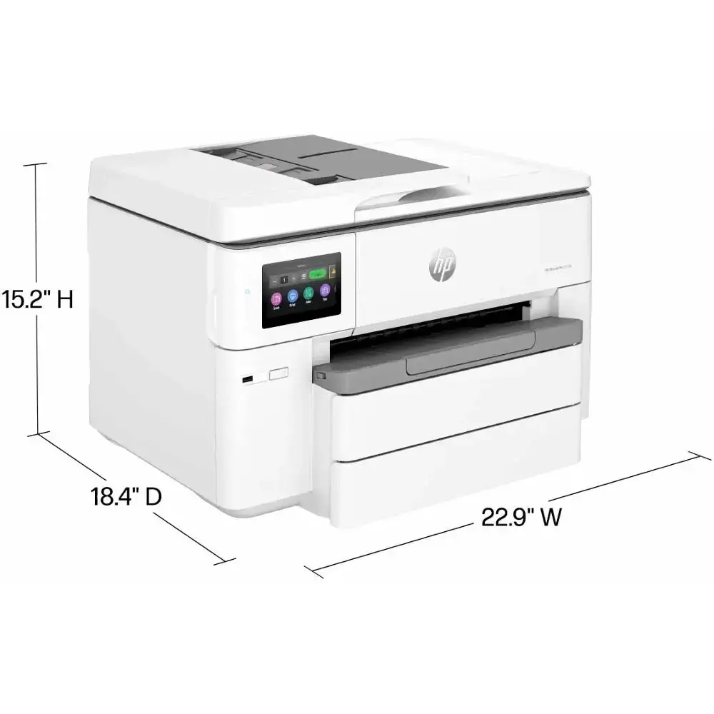 The HP OfficeJet Pro 9730e Wireless All-In-One Inkjet Printer is designed for efficient, high-quality printing with its wide format printing capability, allowing you to print up to 11" x 17". It offers wireless connectivity, making it easy to print from smartphones, tablets, and laptops without the hassle of cables. This all-in-one functionality covers print, scan, copy, and fax needs, streamlining your workflow. With the HP+ subscription, you get 3 months of Instant Ink included, ensuring you never run out of ink. Its fast print speed of up to 22 pages per minute and high-quality prints make it an ideal choice for busy professionals, while its energy-efficient design helps save on power