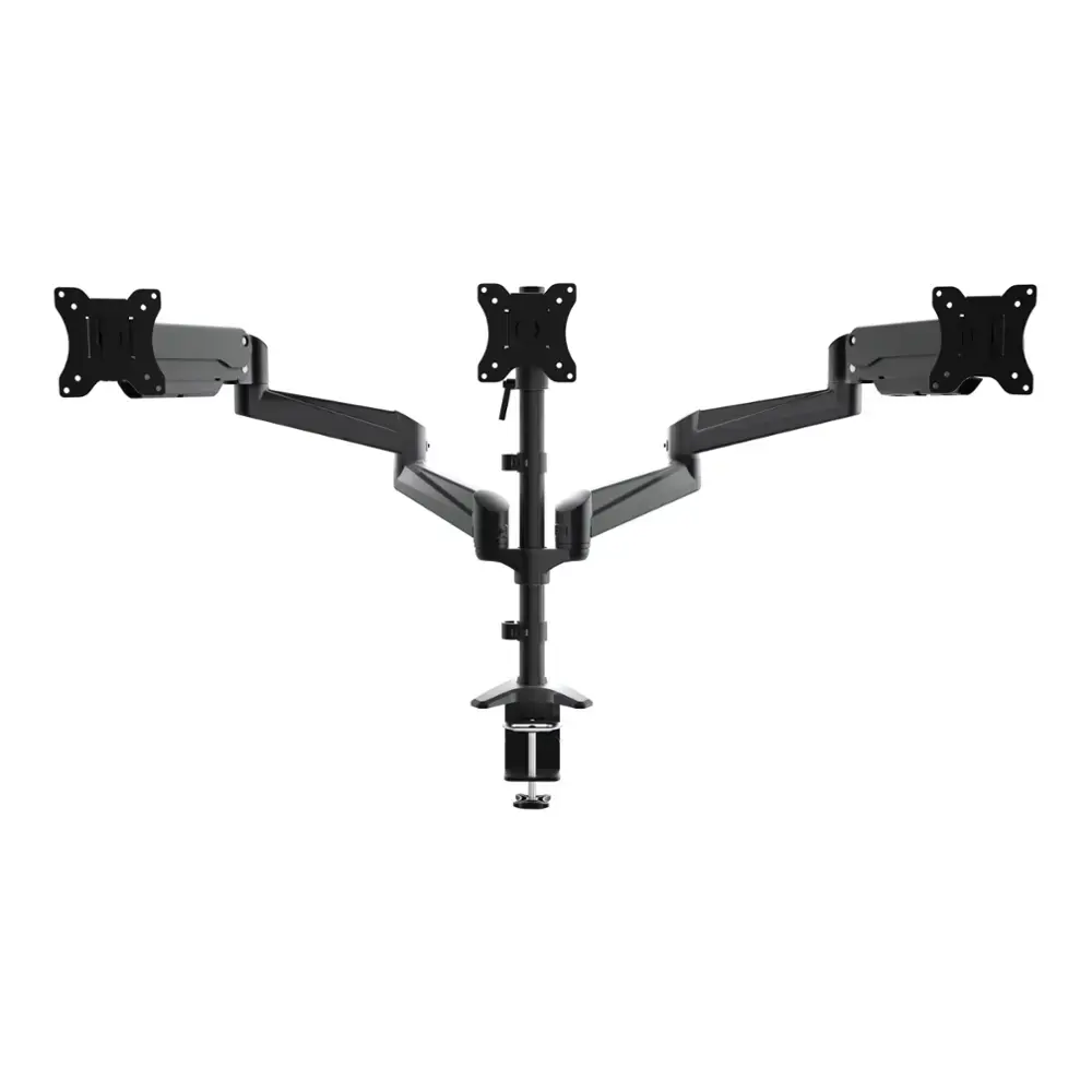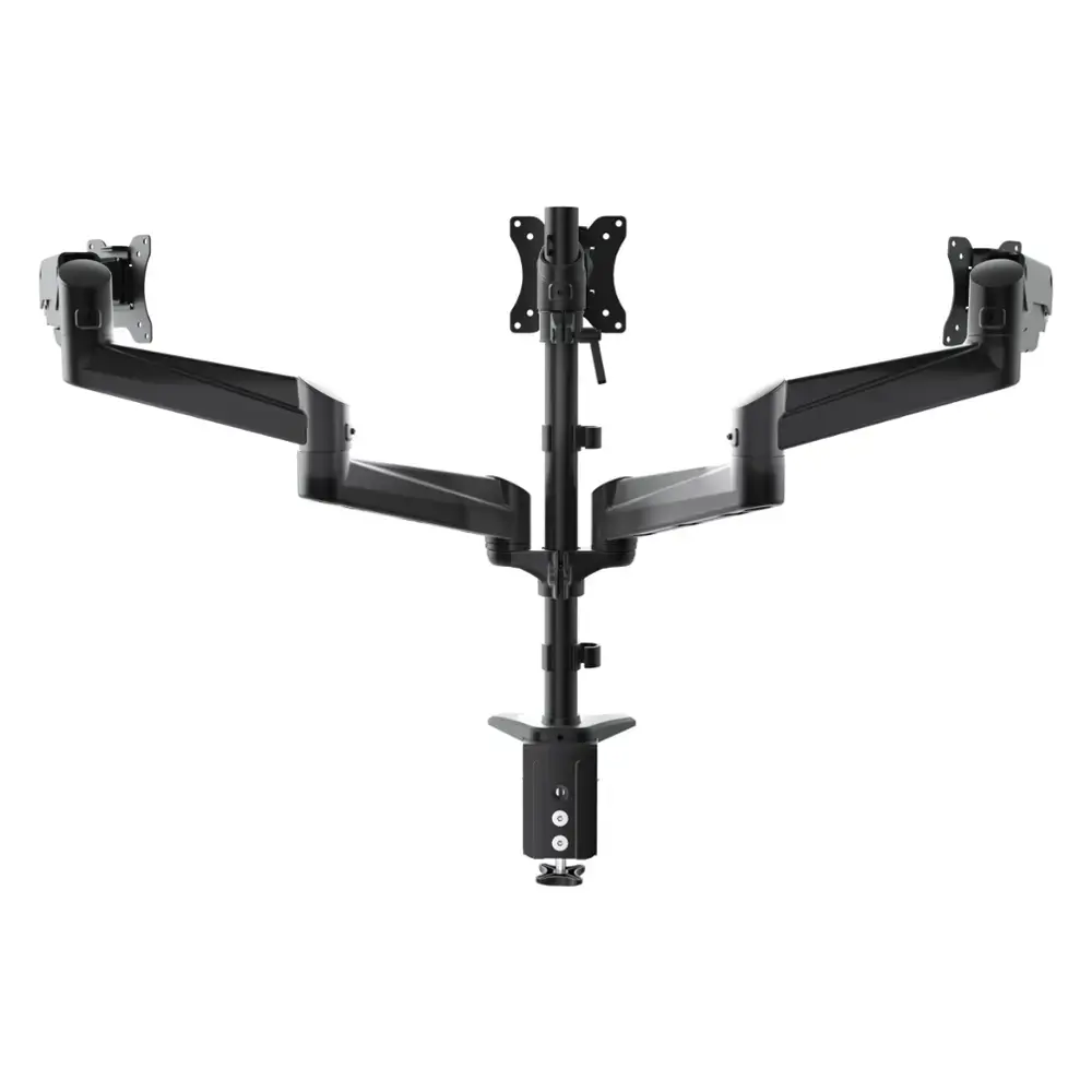 The HNTS8B is a triple monitor desk mount designed for 13-32″ monitors, supporting up to 17.6 lbs. Its gas spring arms make height adjustments effortless – just move the monitors to your preferred position without needing any tools! The sturdy pillar provides extended height adjustments, while height, swivel, and tilt options ensure the monitors are positioned for the best viewing angles. It offers versatile mounting options, including desk clamp or grommet mounts, suitable for different desk types. The integrated cable management system keeps cables neatly organized for a tidy workspace.