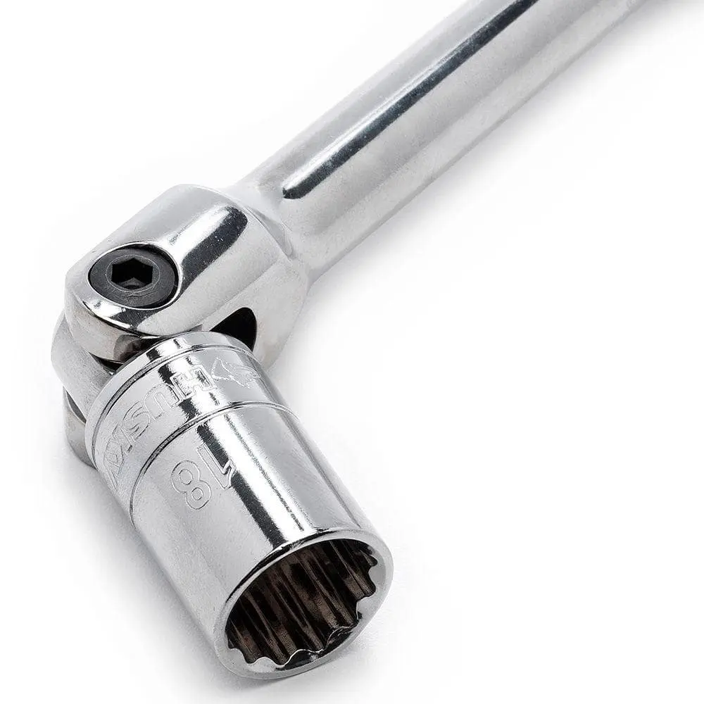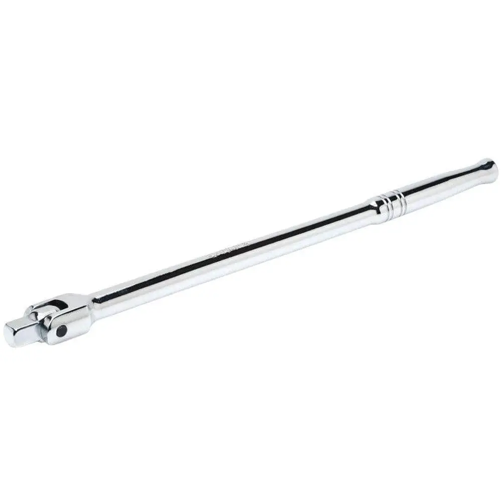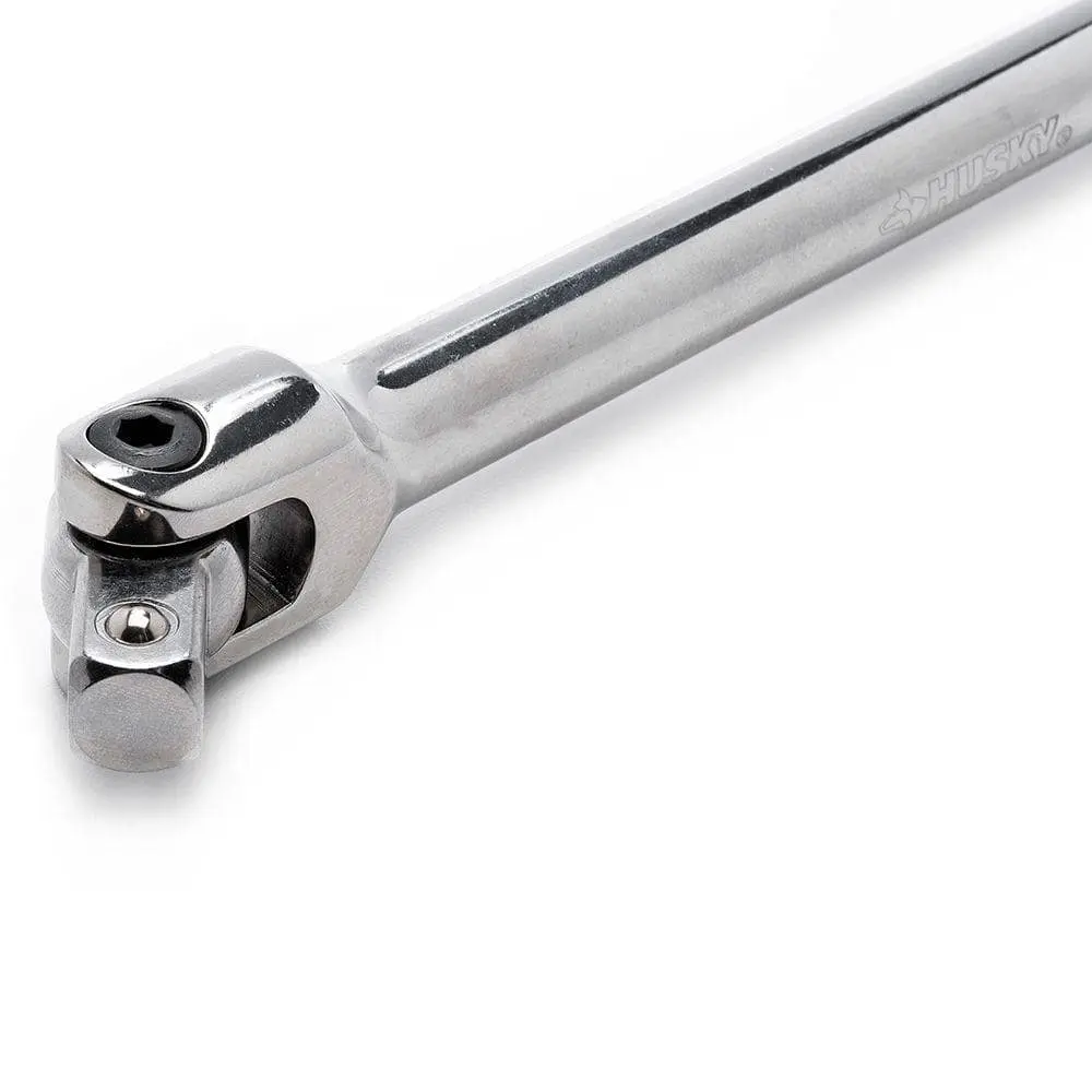 The Husky 1/2 in. Drive 15 in. Breaker Bar is a powerful tool designed for tough jobs, featuring high torque capabilities to effortlessly loosen stubborn fasteners. Built with durable construction, it ensures long-lasting performance even under heavy use. The chrome finish not only resists corrosion but also makes cleaning easy after each task. Its 180-degree flex head provides versatile access to tight and hard-to-reach areas, while the comfortable grip ensures secure and efficient handling. With a 15-inch length, this breaker bar delivers optimal leverage for demanding applications.