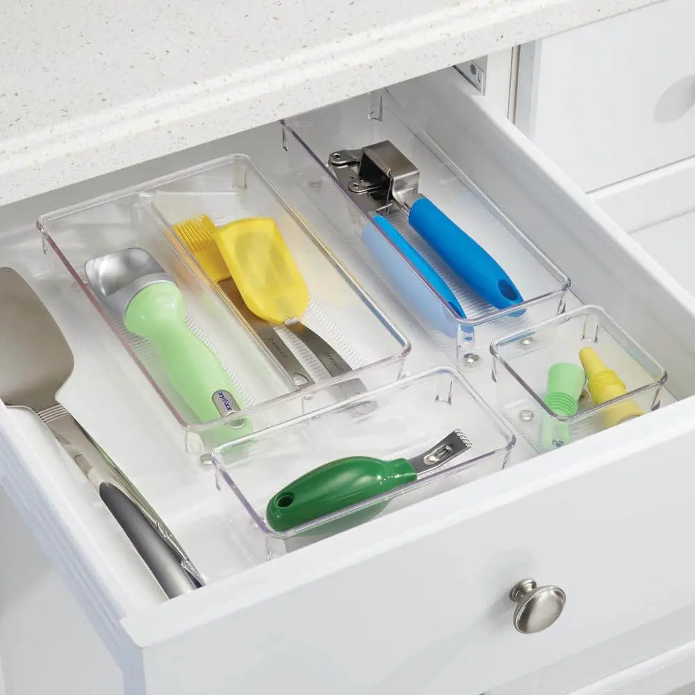 The interDesign Linus Drawer Organizer is a sleek and practical solution for keeping small items neatly stored. Made from durable, clear plastic, it provides a simple, compact design that fits perfectly in drawers, cabinets, or on countertops. This organizer is ideal for sorting utensils, office supplies, and other small items, offering multi-purpose functionality. Its stackable design allows for easy customization and expansion, while the organizer is easy to clean, simply wiping down with a damp cloth to maintain its clarity and appearance
