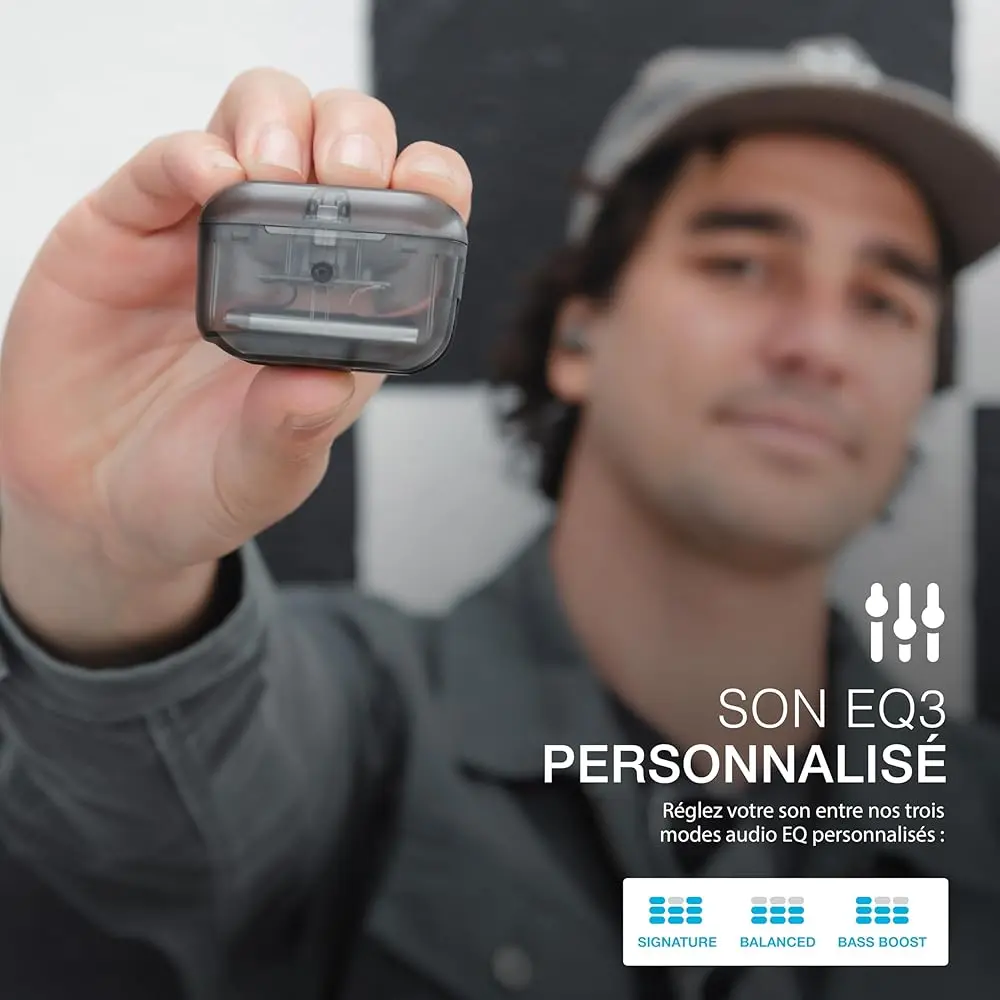 • Three EQ sound modes: JLab Signature, Balanced, and Bass Boost, controlled by touch sensors