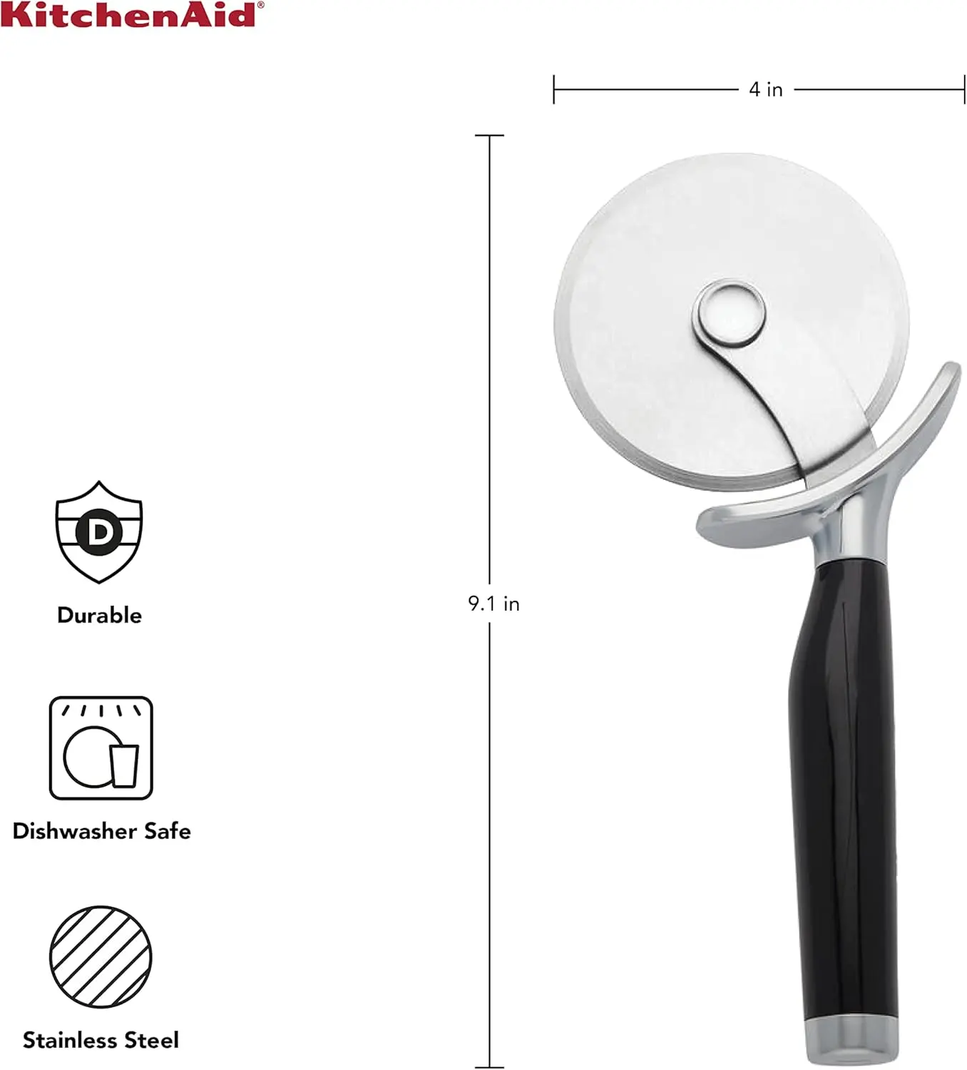 KitchenAid Classic Pizza Wheel with a sharp blade. Features a builtin finger guard for safety and a comfort grip to protect fingers. Dishwasher safe, 9inch, black