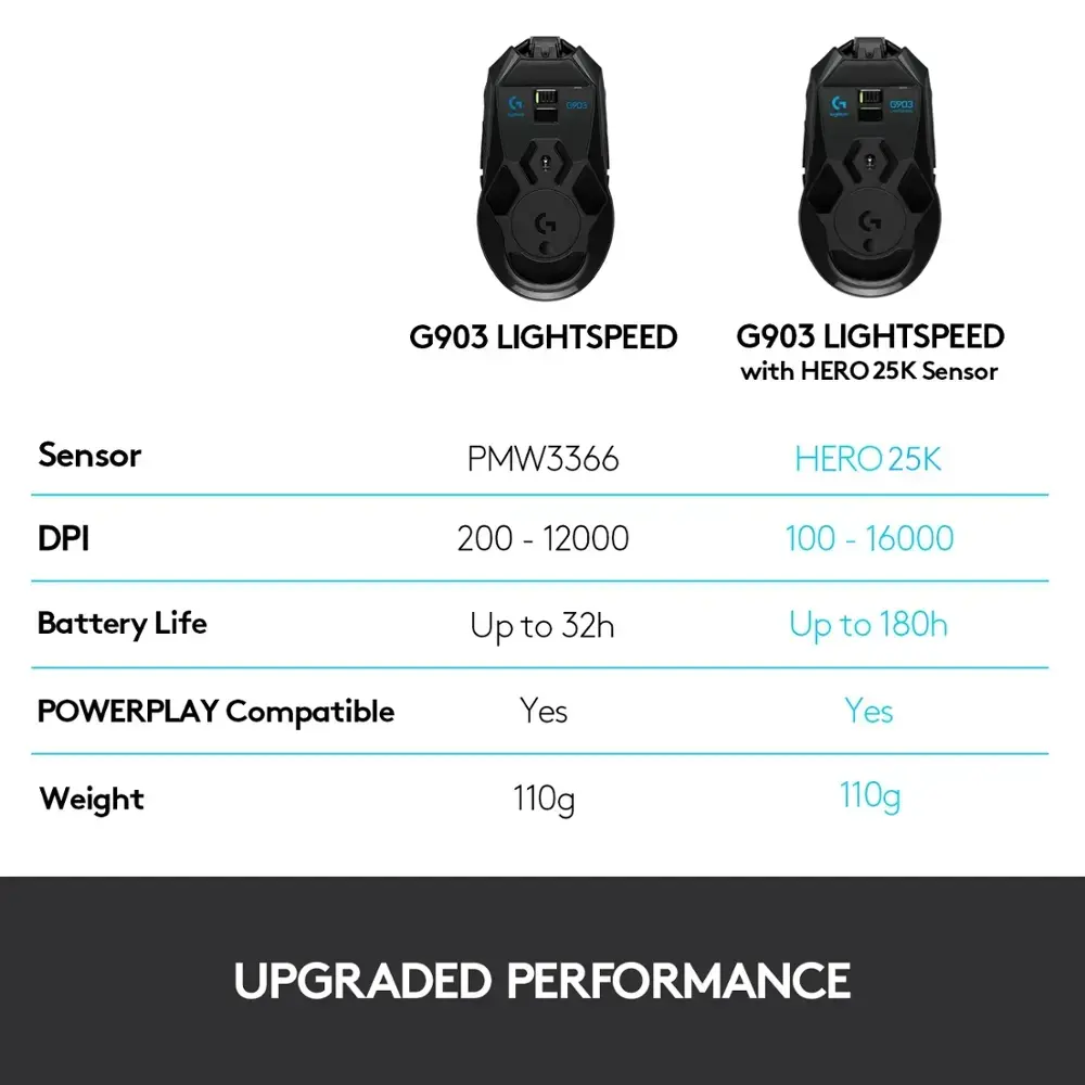 The Logitech G903 LIGHTSPEED Wireless Gaming Mouse delivers ultra-fast, lag-free performance with its advanced LIGHTSPEED wireless technology. Equipped with a HERO 25K sensor, it offers precision tracking up to 25,600 DPI for ultimate accuracy. Its ambidextrous design ensures a comfortable grip for both left- and right-handed gamers. Stay in the game without interruptions, thanks to its PowerPlay compatibility, allowing for wireless charging while you play. Customize your setup with RGB lighting, easily adjustable via Logitech G HUB, and enjoy a lightweight, ergonomic design built for long gaming sessions
