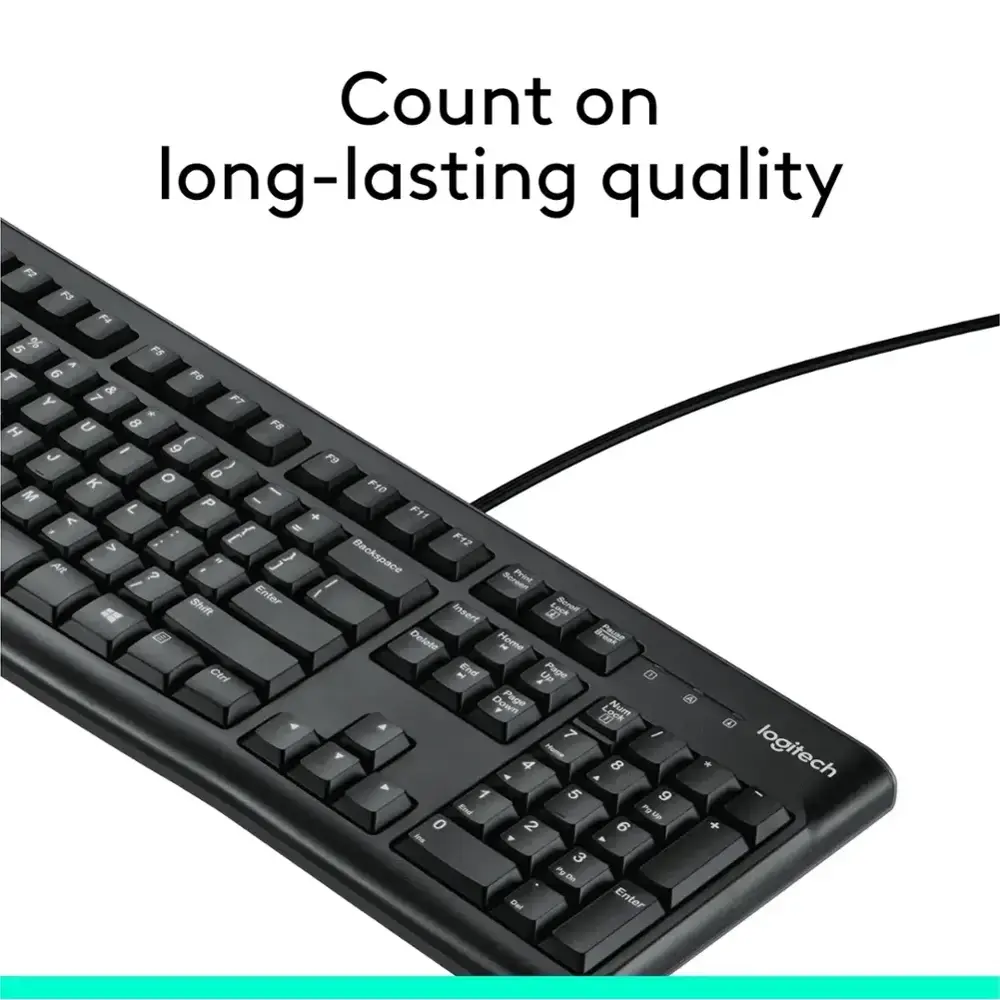 The Logitech Keyboard K120 offers a comfortable and quiet typing experience with its low-profile keys and standard layout, including full-size F-keys and a number pad. Designed for durability, this keyboard features a spill-resistant design, keys that can withstand up to 10 million keystrokes, and sturdy, adjustable tilt legs. Its sleek, thin profile not only looks good but is built to last. Setup is simple—just plug it into a USB port, and it’s ready to use right out of the box. The bold, bright white characters on the keys make them easy to read. As a product of Logitech’s renowned quality and reliability, this keyboard is perfect for both home and office use.