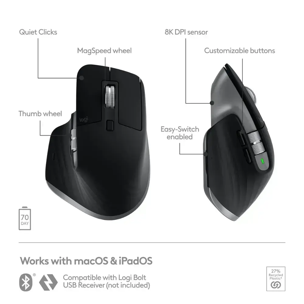 - MagSpeed Scrolling – Scroll 90% faster and 87% more precise than a standard mouse, with ultra-quiet operation.