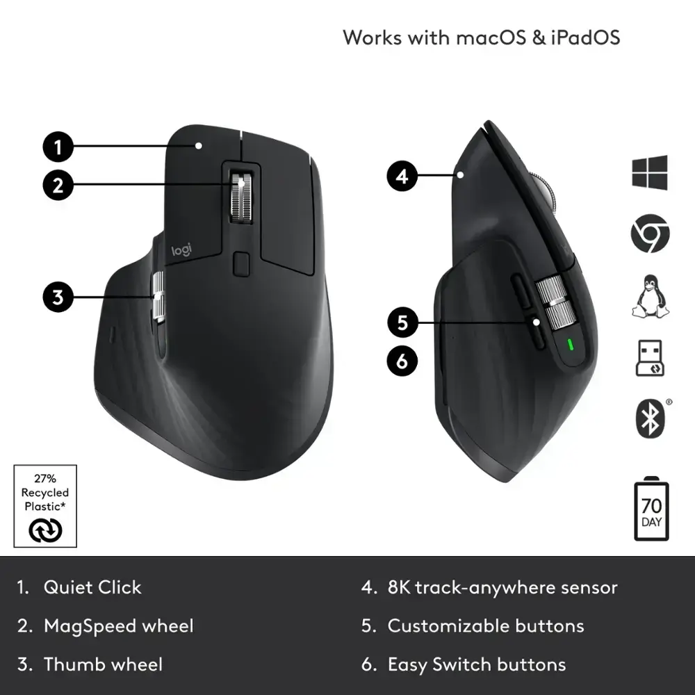 Logitech MX Master 3S – an iconic mouse, now remastered. Designed for designers and coders, it features Quiet Clicks, 8K DPI any-surface tracking, and an ergonomic shape for all-day comfort. Work seamlessly across multiple devices and operating systems with enhanced customization and fluid control.