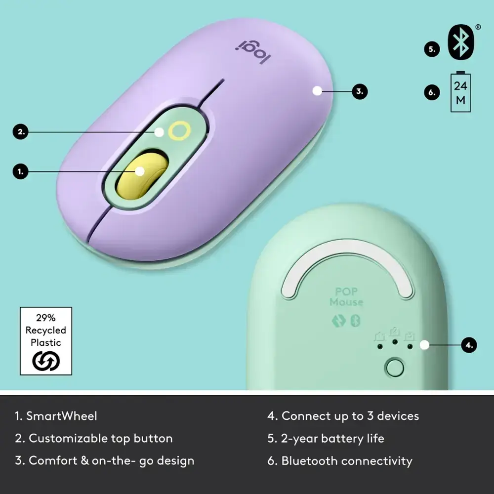The Logitech POP Mouse Bluetooth Optical Ambidextrous Mouse in Daydream Purple (Mint) offers a fun and functional design. With Bluetooth connectivity, it ensures a wireless and clutter-free experience. You can make it your own with customizable emojis, adding a personal touch to your mouse. Its ambidextrous design makes it comfortable for both left and right-handed users, while the optical sensor provides smooth and precise tracking. Lightweight and compact, it’s perfect for on-the-go use. Enjoy long sessions with its long battery life, and stand out with the stylish Daydream Purple (Mint) color