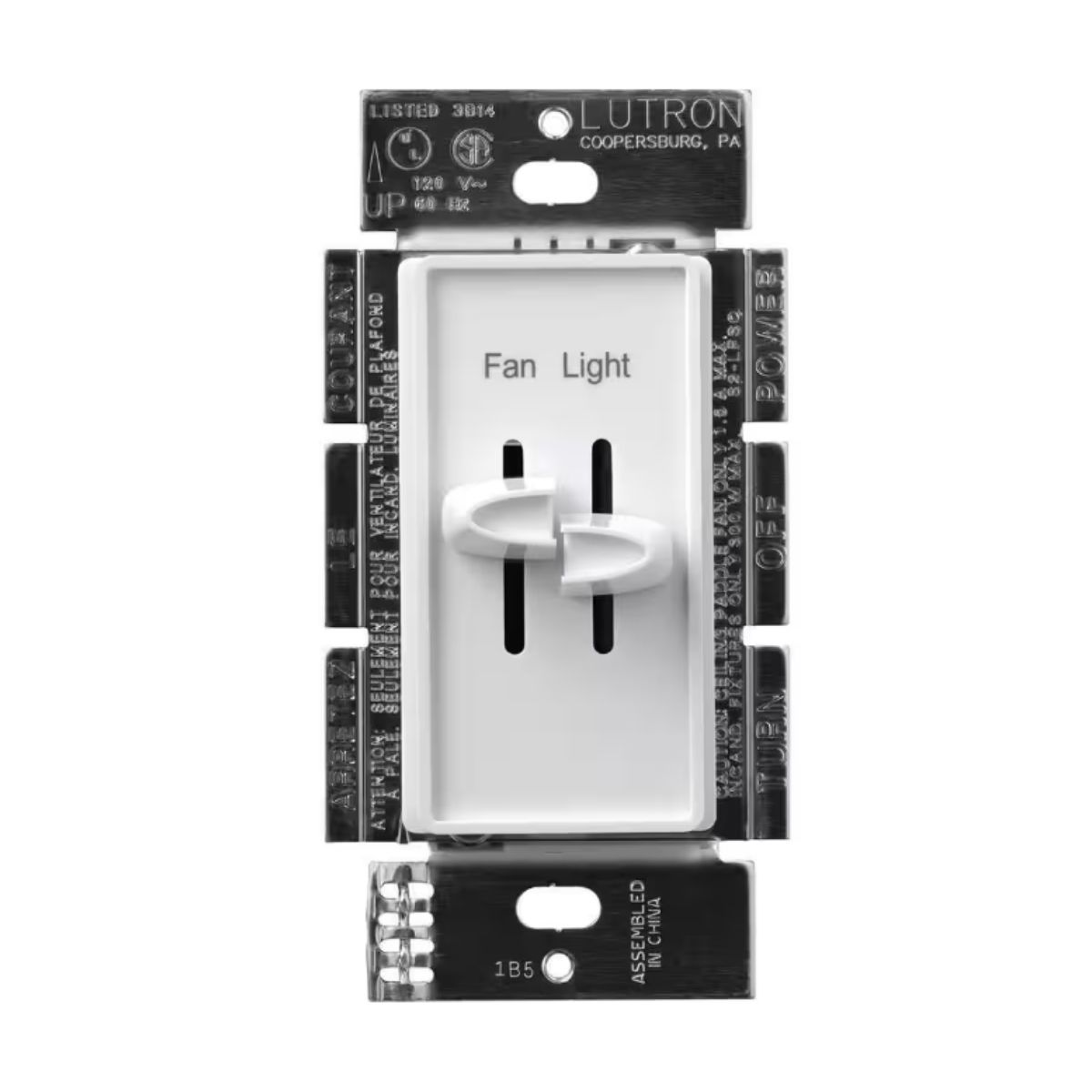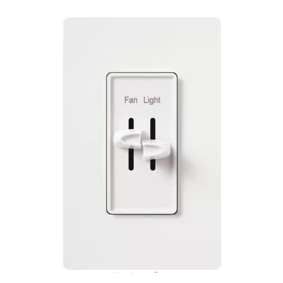 Easily manage your ceiling fan and light fixture using the Skylark Dual Slide-to-Off Fan Control and Dimmer. Utilize the simple sliders to adjust the fan speed and control the brightness of the lights according to your desired preferences.