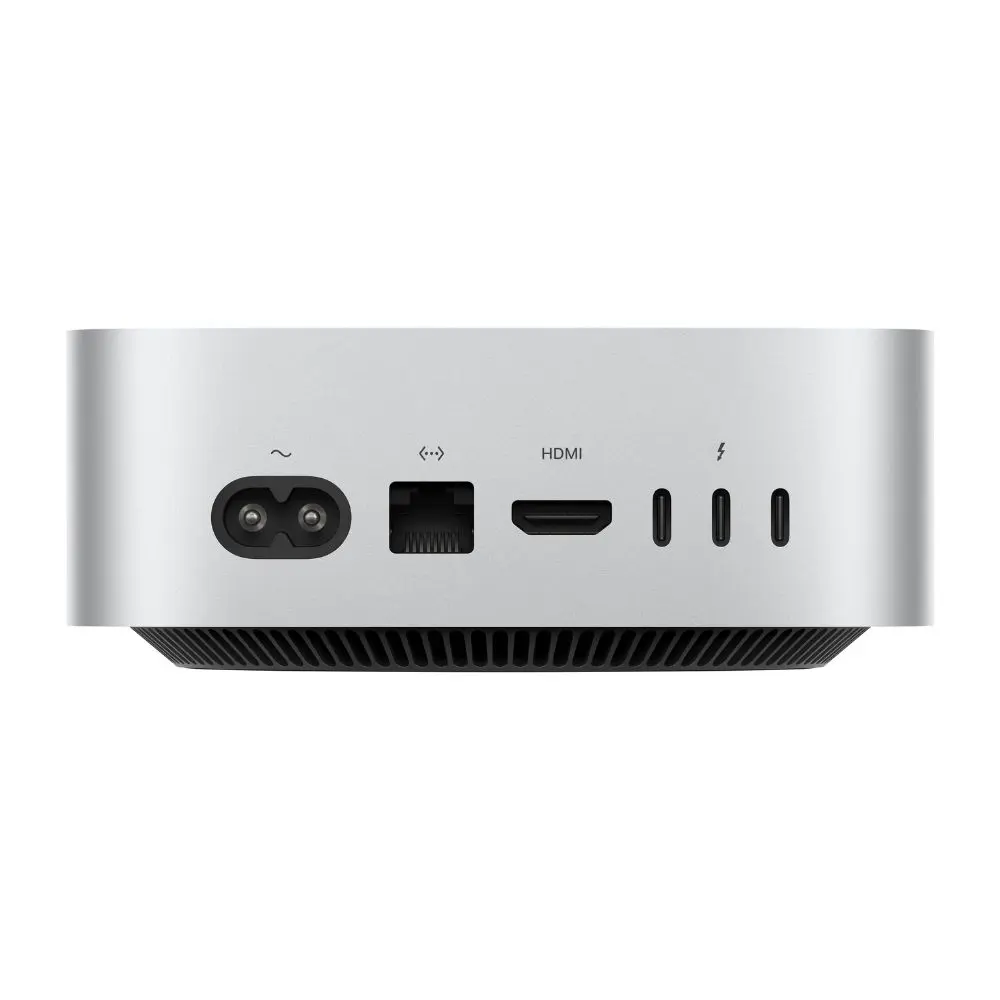 The Mac Mini with M4 delivers powerful performance in a compact design. Equipped with a 16-core Neural Engine, it enhances machine learning and AI tasks, offering a smooth and efficient experience. On the front, it features two USB-C ports and a headphone jack, while the back includes three Thunderbolt 4 ports, an HDMI port, and Gigabit Ethernet for versatile connectivity.