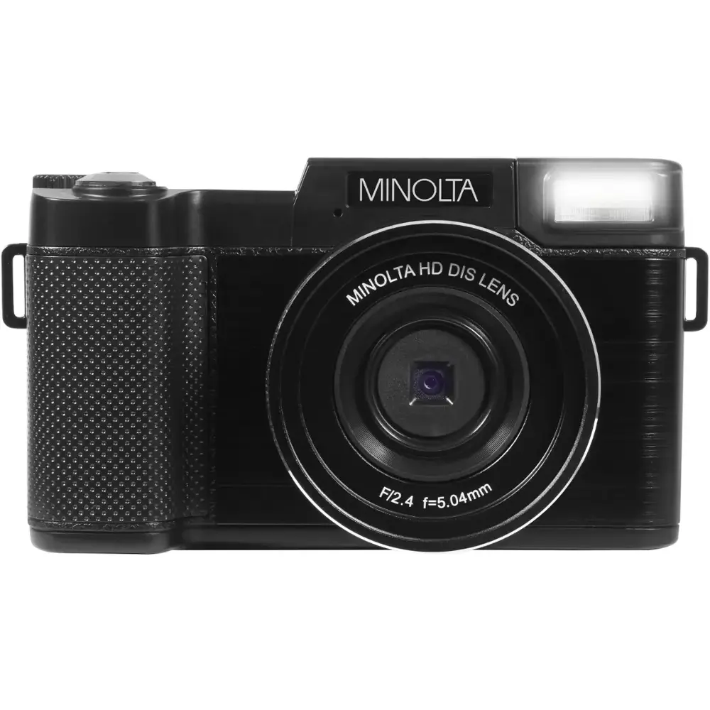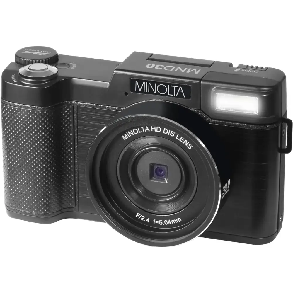 The Minolta MND30 is a user-friendly, compact camera that delivers high-resolution images and sharp 2.7K QHD video in a convenient package. Equipped with a clear lens and 4x digital zoom, this camera is versatile enough for various shooting scenarios. Thanks to a powerful sensor, it captures 30-megapixel stills and 2.7K video with impressive clarity. The 3.0" 230k-dot articulating IPS LCD screen and built-in retractable flash make image composition and review simple. The camera features a microSD card slot, preloaded with a 32GB card, and is compatible with cards up to 128GB. Additionally, intelligent scene modes ensure optimal results, and the 52mm front lens threading allows for attaching lenses and filters.