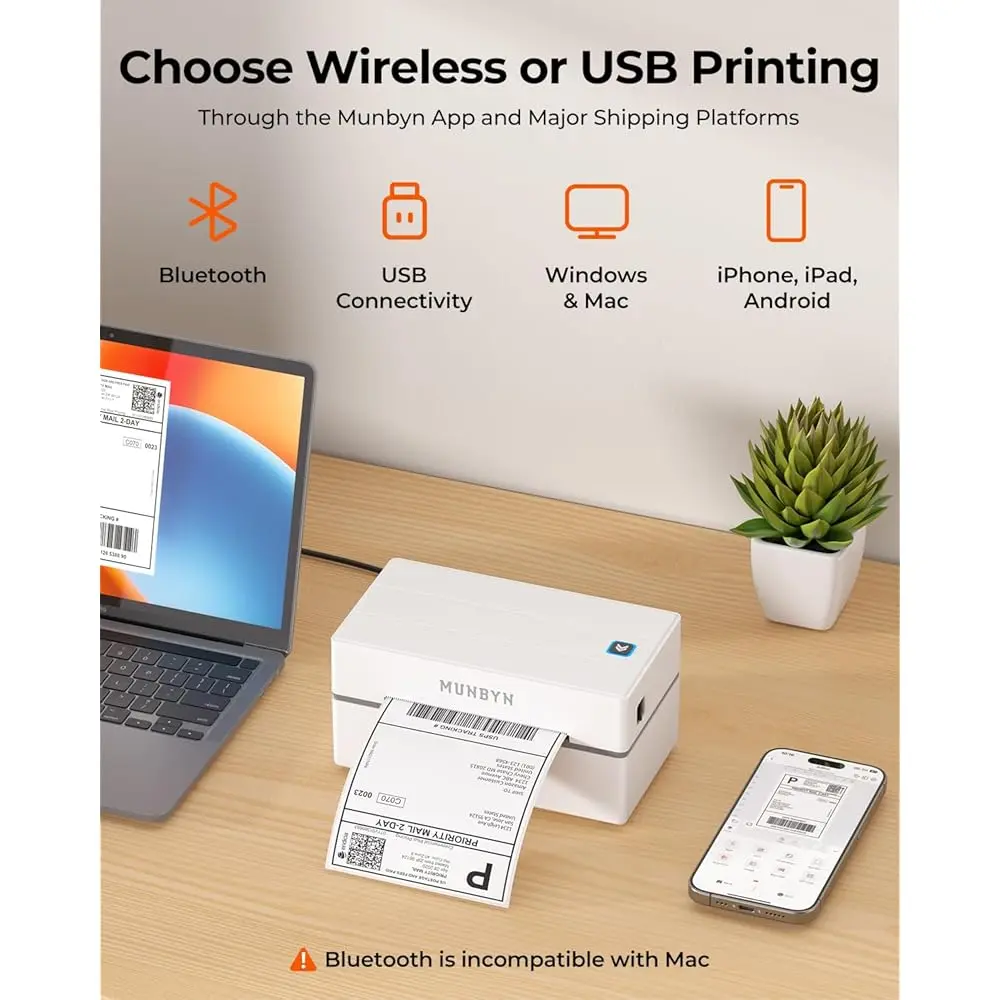 - Effortless Setup & Use: Connect via Bluetooth to iOS, Android, or Windows, or use USB for macOS. Simply connect, design, and print with the MUNBYN Print app or PC Editor.