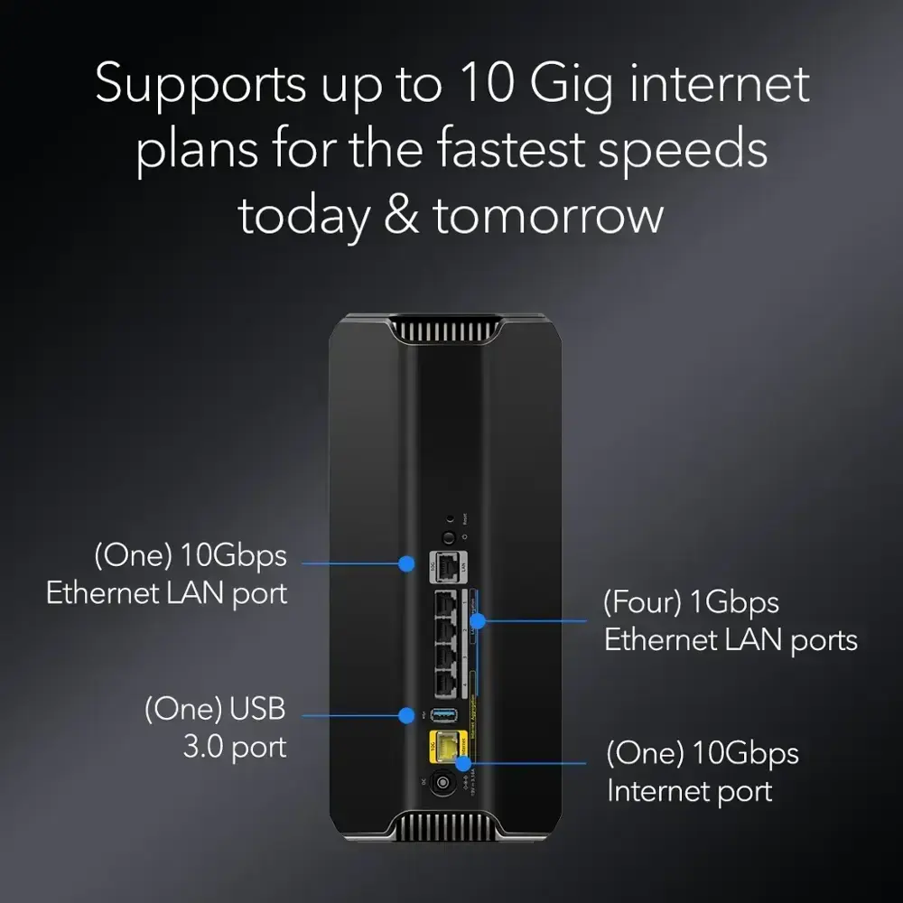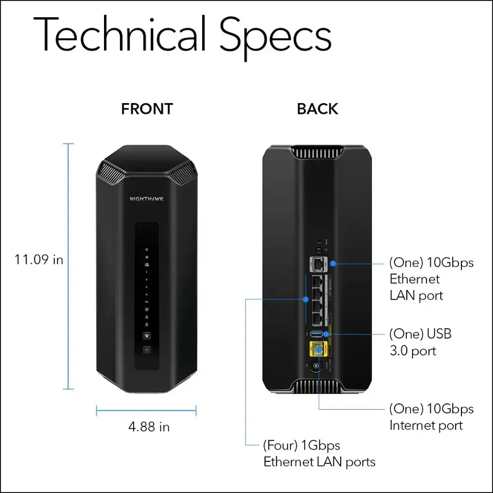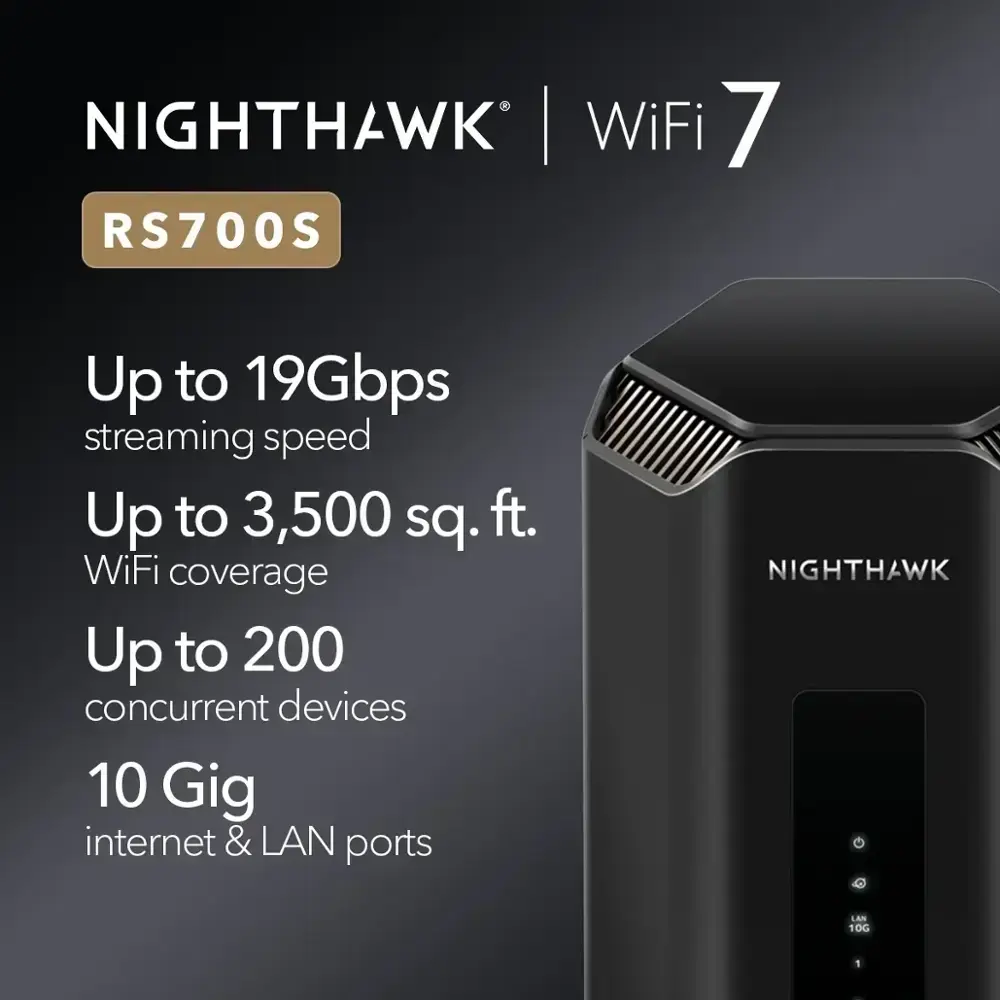 The NETGEAR Nighthawk BE19000 Tri-band Wi-Fi Router is designed to deliver top-tier performance for modern homes and offices. Featuring tri-band Wi-Fi, it supports 2.4GHz, 5GHz, and 6GHz bands for fast and reliable connections across your devices. With Wi-Fi 6E technology, this router offers faster speeds and greater capacity, ensuring smooth connectivity even with multiple devices. Equipped with 4 x 1G Ethernet ports, it provides reliable wired connections for activities like gaming or streaming. The 12-stream Wi-Fi technology ensures seamless, high-speed performance across all connected devices. For added protection, it includes advanced security with WPA3 encryption, safeguarding your network. Powered by a powerful processor, it supports uninterrupted performance for all your connected devices, while the easy setup via the Nighthawk app makes installation a breeze