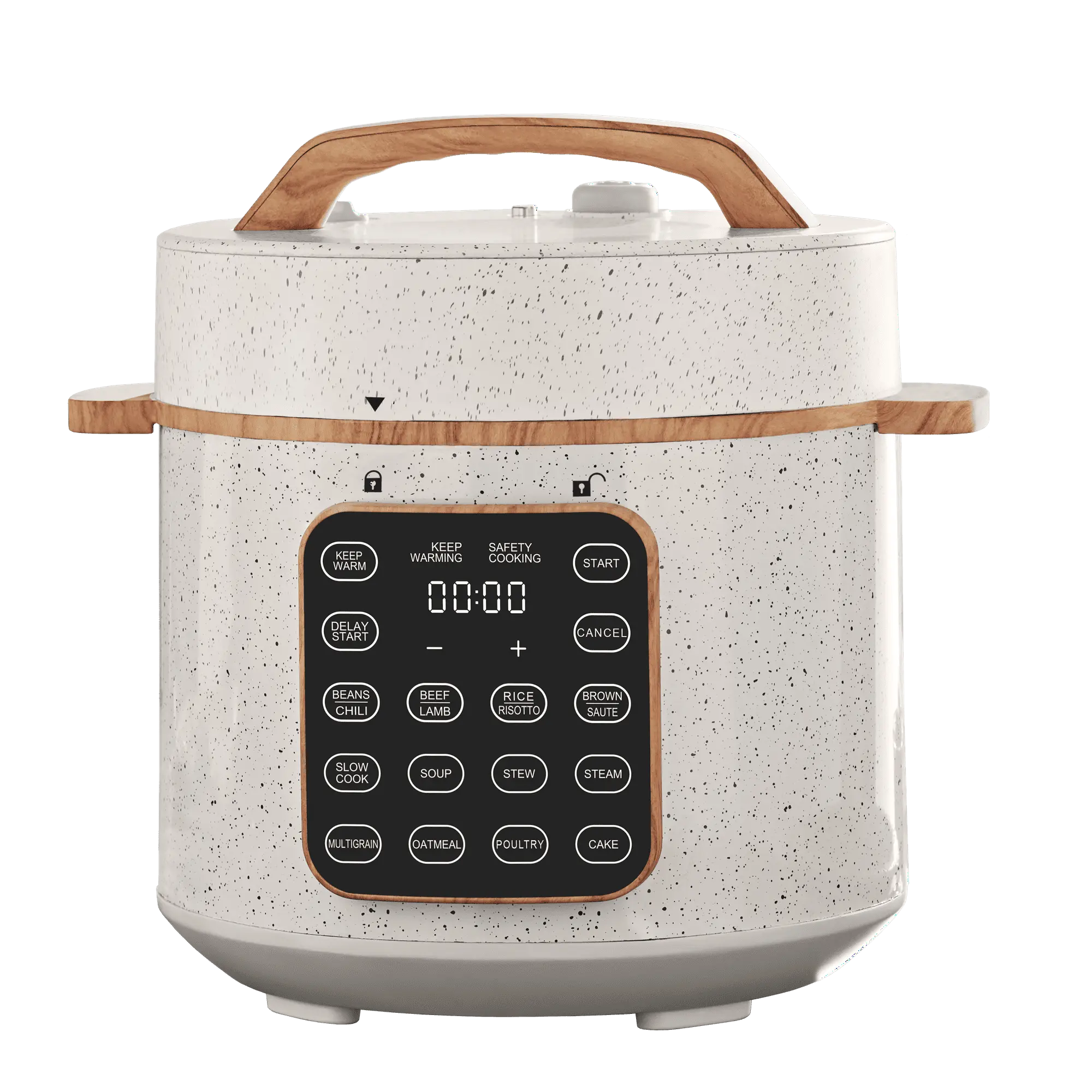 Introducing the latest innovation from The Pioneer Woman's collection of kitchen appliances—the 6-Quart Pressure Cooker! This stylish and versatile appliance features a chic linen speckle and wood grain design, complete with a convenient blinking display and touch control interface. Whether you're a busy home cook or a culinary enthusiast, this multi-cooker is bound to become your essential kitchen companion. With 12 pre-set smart cooking recipes, you can effortlessly prepare a wide variety of delicious meals at the touch of a button. From soups and beans to rice, poultry, cake, beef, eggs, and more, this appliance simplifies meal prep.