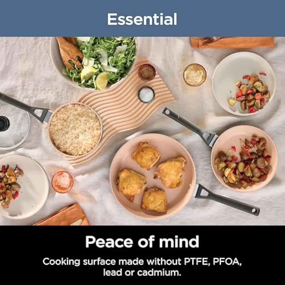 The Ninja 10-Piece Nonstick Ceramic Cookware Set includes a versatile range of cookware for all your cooking needs. It features a 1.5 qt. saucepan with lid, a 2.5 qt. saucepan with lid, an 8" fry pan, a 3 qt. sautpan with lid, a 6 qt. stock pot with lid, and a 10.25" fry pan. Made with durable ceramic and nonstick coating, this set provides even heat distribution and easy food release. The set is compatible with all cooktops, including induction, and is dishwasher safe for easy cleanup. Perfect for a variety of cooking tasks, its designed to offer long-lasting performance and convenience in the kitchen.