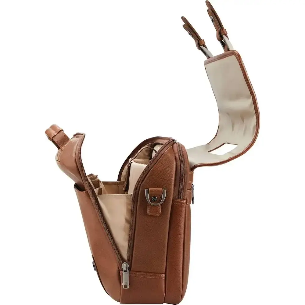 Carry your laptop in style with this Samsonite Classic Leather Flapover Bag. It features a padded pocket that securely holds laptops up to 15.6 inches during transit, while the adjustable strap ensures comfortable carrying. The bag also includes a spacious front pocket, perfect for storing phones, office supplies, and other small essentials.