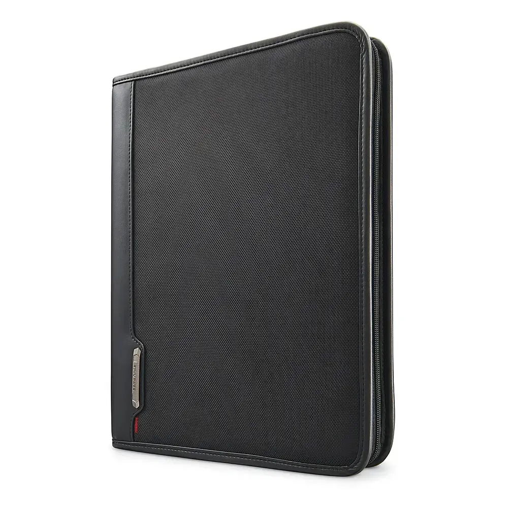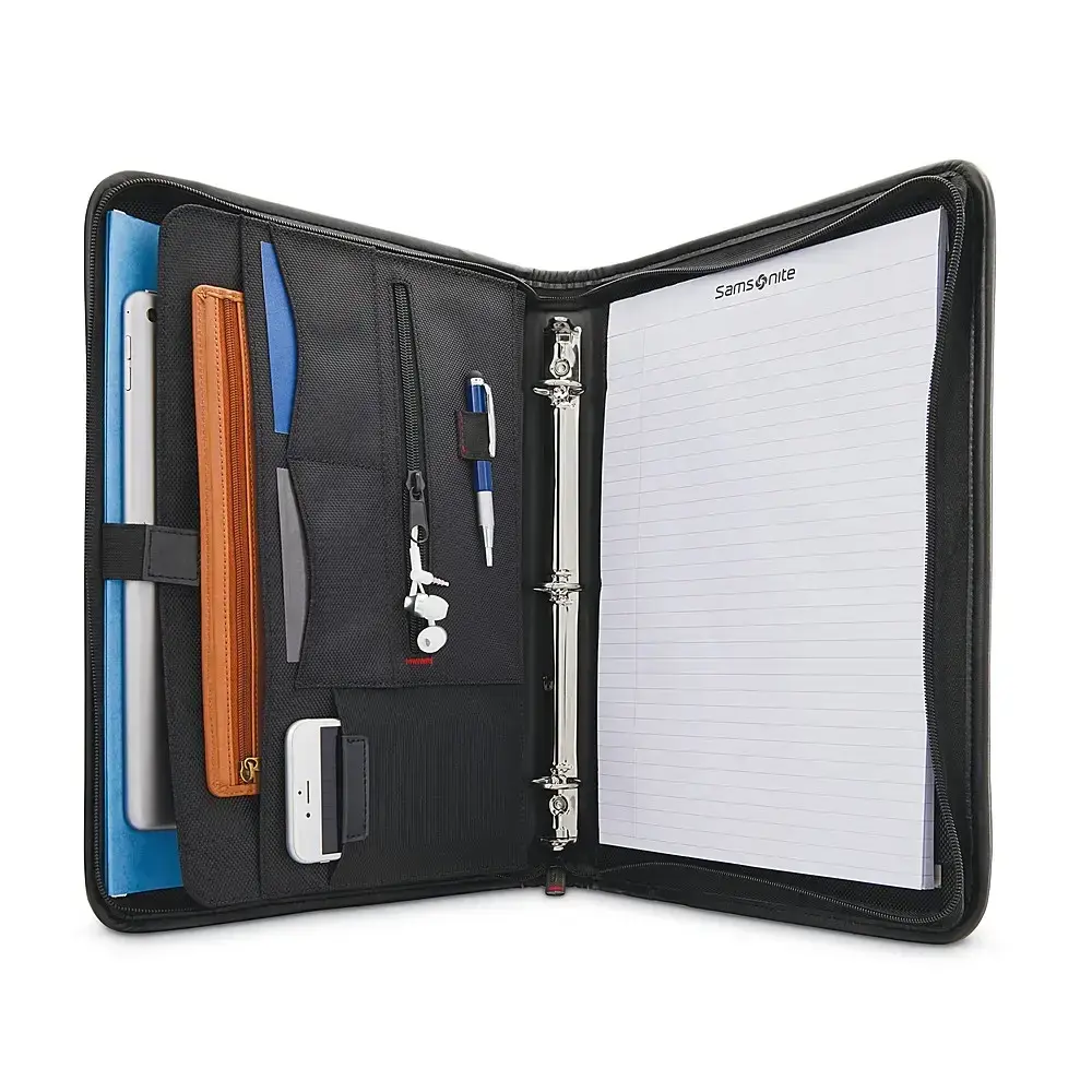 Stay organized with this sleek and compact Samsonite leather padfolio, designed to keep your business essentials in place. It features dedicated spaces for folders, business cards, your phone, and tablet. The padfolio also includes a writing pad and a pen loop holder, along with a 1" three-ring binder and a secure inner zipper pocket. Crafted from durable ballistic fabric with vinyl trim, this classic black padfolio is accented with a matte gunmetal textured logo.