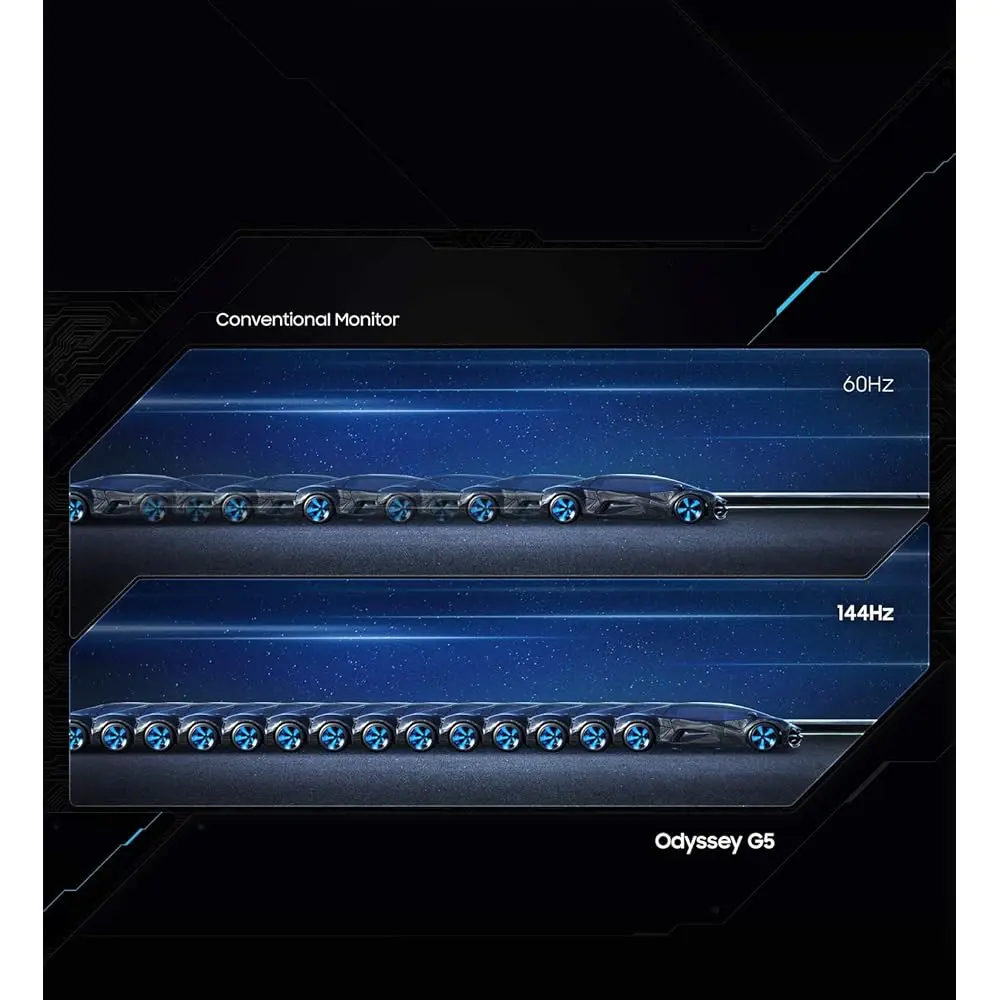 Product Description: Dive into a new era of gaming with the Samsung Odyssey G5 curved gaming monitors. Designed for peak performance, the G5 lineup offers a variety of gaming monitors with enhanced features at an attractive price point. The 1000R curved panel is specifically crafted to align with the natural curvature of the human eye, providing deeper immersion and reducing eye strain. Coupled with a 144Hz refresh rate, its built for seamless gameplay and ensures smooth action as you climb the leaderboards. Experience vivid, lifelike visuals with WQHD resolutionboasting 1.7 times the pixel density of Full HD for sharper, more detailed images. AMD FreeSync Premium enhances performance by minimizing screen tearing and stuttering, offering smooth transitions even during fast-paced scenes. The 1ms response time ensures instant feedback, allowing you to react in real time. Additionally, HDR10 breathes life into your games with vibrant colors, deeper blacks, and stunning details, making your gaming experience more immersive than ever.