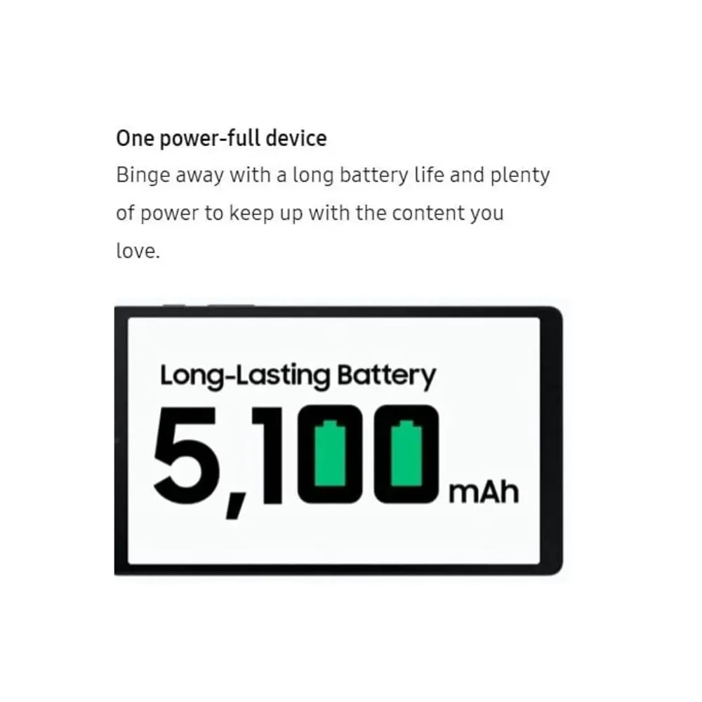 Powered by an efficient Mediatek Helio P22T processor and running on Android 11 with Samsung’s intuitive One UI, this tablet is ideal for streaming, browsing, and light productivity. Its 5100mAh battery provides long-lasting power, keeping you connected through the day without frequent recharging. Dual speakers deliver enhanced audio, making it great for movies and music.