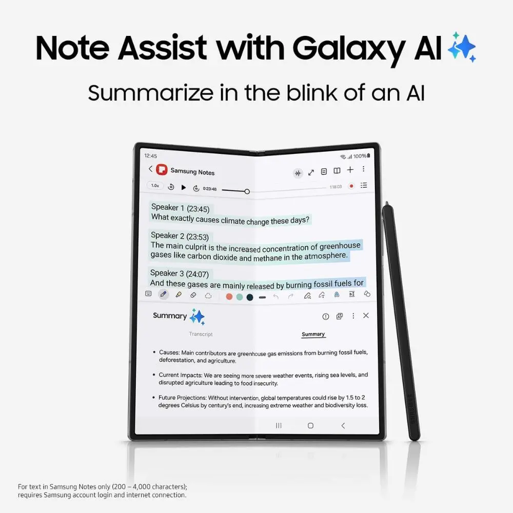 ¹Circle to Search: Requires internet connection; results may vary based on the image’s uniqueness, clarity, and framing. ²Galaxy AI: Free until the end of 2025 on supported Samsung Galaxy devices. Requires Samsung account login and preset language (English and Spanish pre-installed; additional languages require a free download). Results may vary. ³Generative Edit: Free until the end of 2025 on supported devices, requires Samsung account login and internet. Photo edits resize up to 12MP. ⁴Multi-Active Window: Compatible with select applications; app compatibility continues to expand. ⁵Note Assist: Works within Samsung Notes for text between 200 and 4,000 characters; requires Samsung account login and internet. ⁶Samsung Health Monitor: Sold separately. Requires a Samsung Galaxy Smartphone with Android 11.0 or later, 2GB+ RAM, and Samsung Health Monitor app version 6.22 or later. Heart rate software is not intended for diagnosis, cure, or treatment of any disease. Fold6 AI features remain free on supported devices until 2025. ⁷Live Translate: Compatible Galaxy device required; Samsung account login needed with preset languages (additional languages downloadable for free).