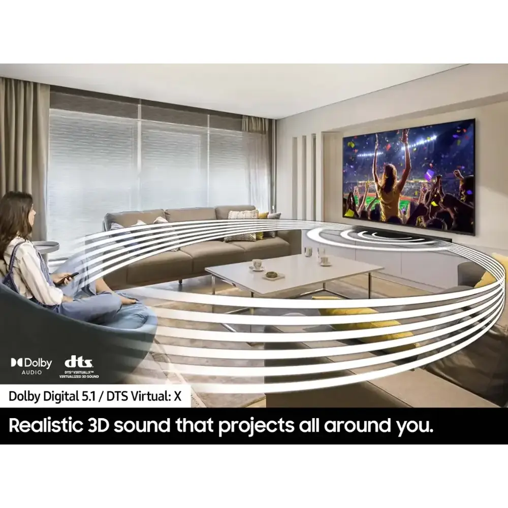 The Samsung HW-S50B 3.0 Channel S-Series Soundbar offers crystal-clear audio with Dolby 5.1 and DTS Virtual:X technology for a captivating surround sound experience. Featuring a built-in center speaker for enhanced dialogue clarity and Adaptive Sound Lite for optimized performance, this soundbar ensures high-quality sound across various content types. With Bluetooth and Wi-Fi connectivity, enjoy seamless streaming with a sleek, stylish design