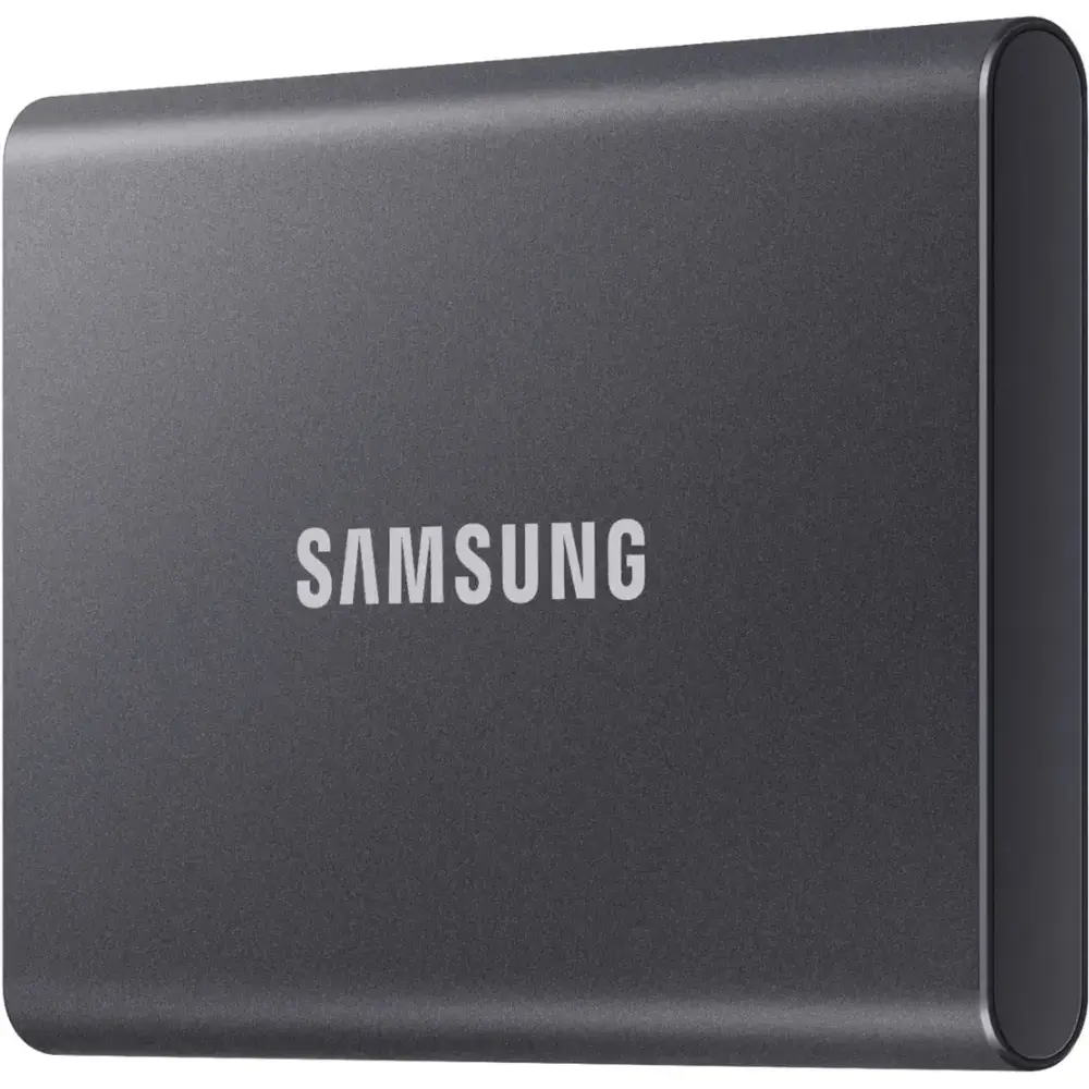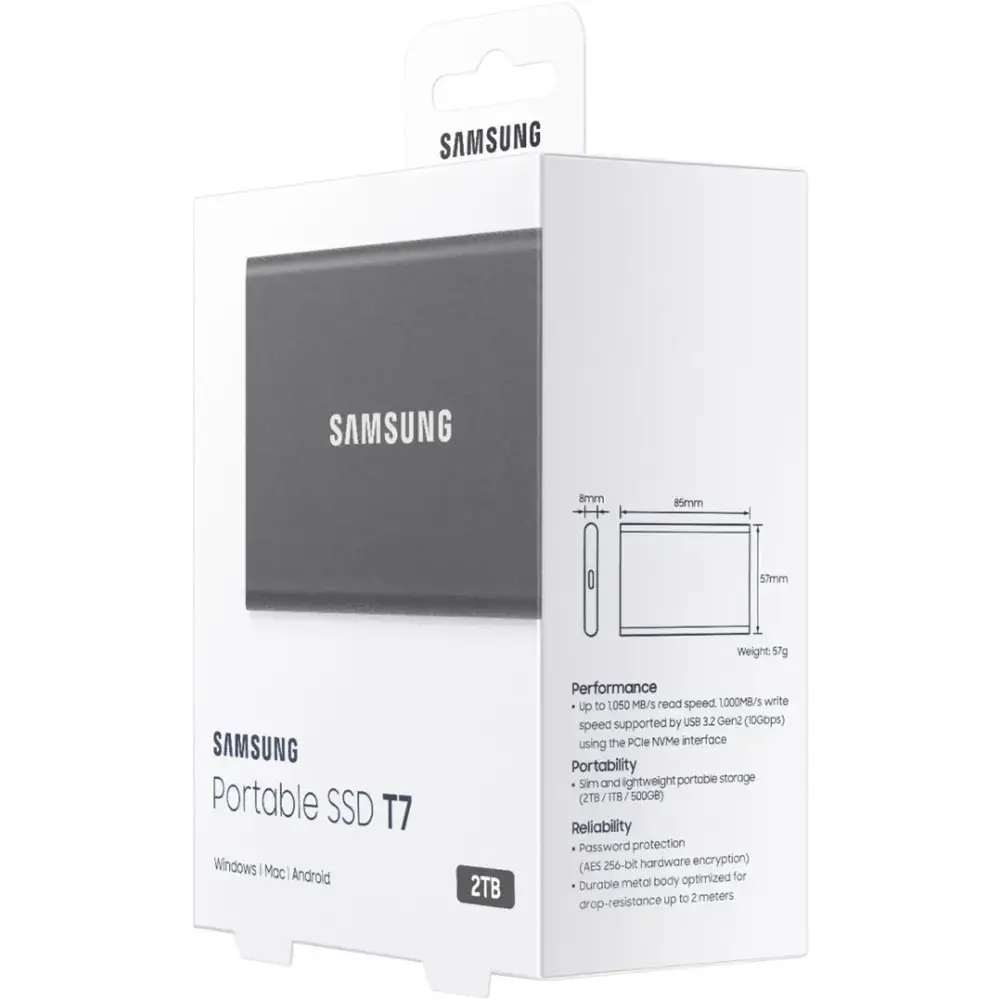 Keep your data secure and transfer files quickly with the Samsung T7 2TB Portable SSD in sleek gray. Featuring USB 3.2 Gen 2 technology, this SSD delivers rapid data transfers, while its durable thermal construction protects against impact and overheating. It includes password protection with 256-bit AES encryption for added security and comes with software and two cable types to ensure seamless file management across multiple platforms.