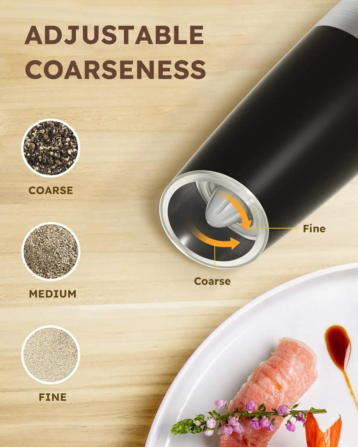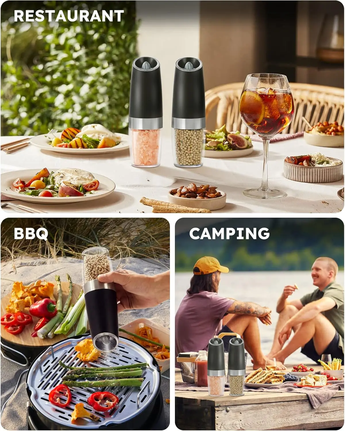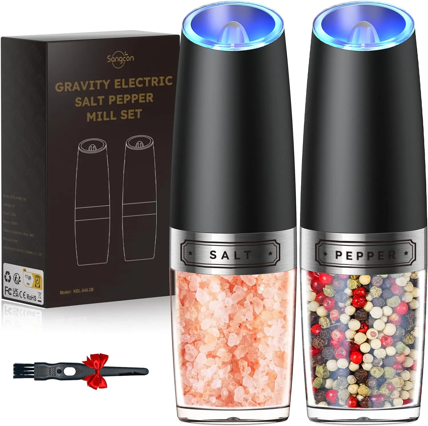 UPGRADED LARGE CAPACITY: The Sangcon electric salt and pepper grinder set features an upgraded capacity of 184g (6.5oz) for sea salt and 100g (3.5oz) for white pepper. Made from transparent food-grade acrylic, the spice bottles are easy to refill through the 2.3-inch opening and simple to clean, as the bottle separates from the motor and spout.GRAVITY SENSING AUTOMATIC OPERATION: Using advanced gravity sensing technology, this grinder allows for effortless one-handed use. Just flip it over to grind spices without manual effort. Each grinder requires 6 AAA batteries (not included). It's a perfect gift for occasions like Mothers Day, Fathers Day, or Christmas.ADJUSTABLE COARSENESS: The battery-operated grinders come with an adjustable ceramic knob to customize spice coarseness. Ideal for grinding pepper, salt, and other spices, they're convenient for use in the kitchen, at restaurants, or during outdoor gatherings.BLUE LED LIGHT: Equipped with a blue LED light that activates when in use, this feature not only illuminates the spices but also creates a warm ambiance for dining, even in low light.