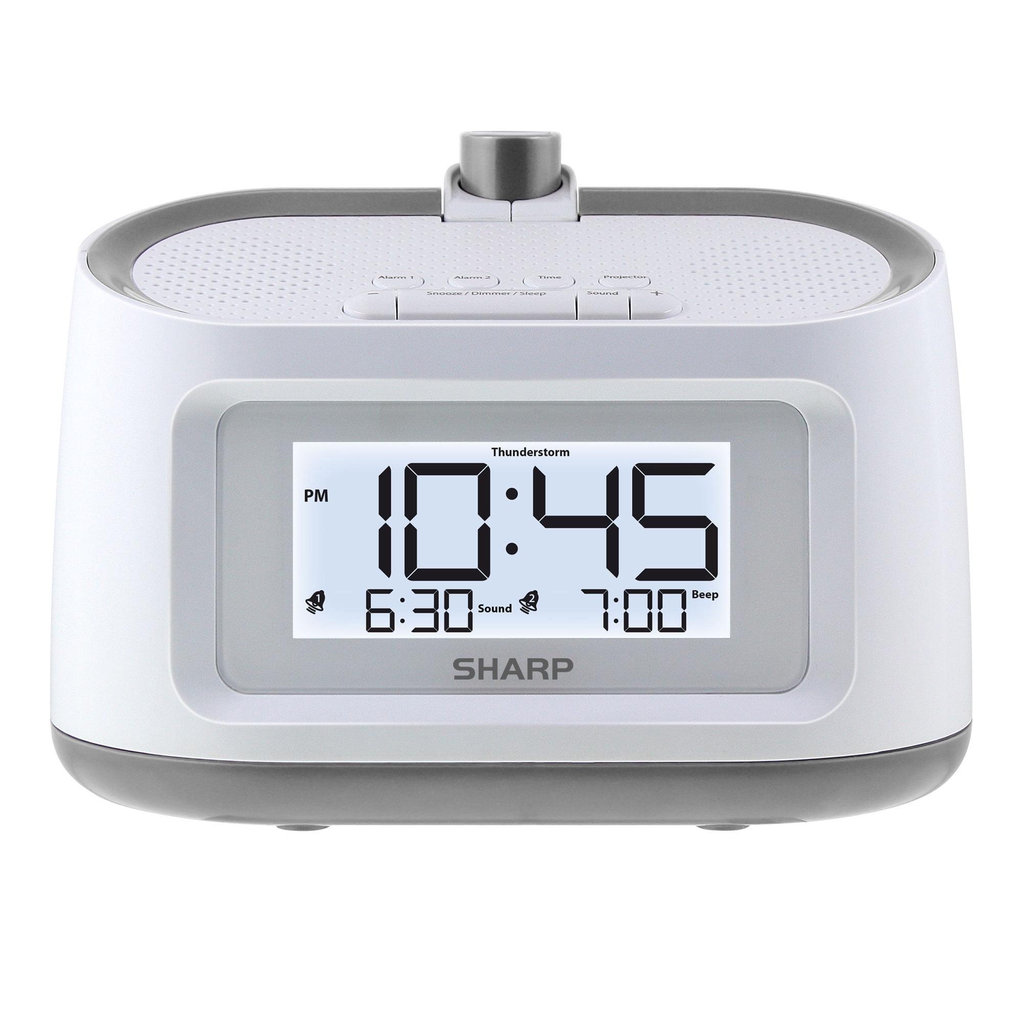 Select from 8 soothing sleep sounds on the Sharp Projection Alarm Clock to help you fall asleep: Calm, Ocean, Rain, Campfire, Thunder, White Noise, Brown Noise, or Lullaby. The sound timer includes an automatic turn-off feature. The adjustable projection arm allows you to customize the time display on your wall or ceiling. Additionally, you have two alarm settings and a 4-step dimmer control to adjust the brightness.