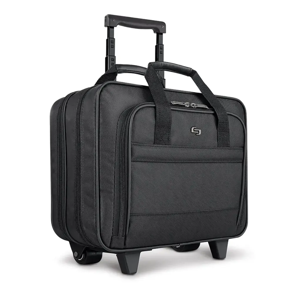 The case features a padded compartment that protects laptops up to 15.6" in size. It includes a full-size front zip-down organizer for easy storage and a divided file compartment to keep documents neatly separated. For convenience, the case is equipped with padded carry handles and a telescoping handle system, making it easy to transport. Its lightweight design and easy glide wheels ensure smooth and effortless movement.